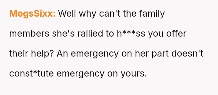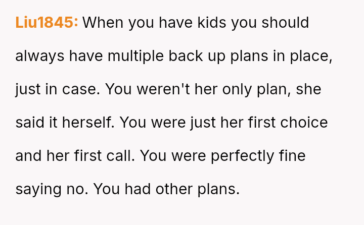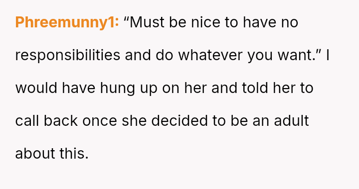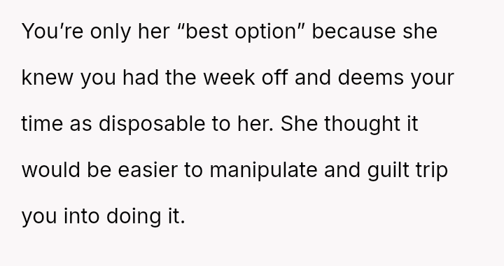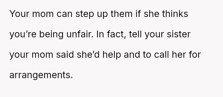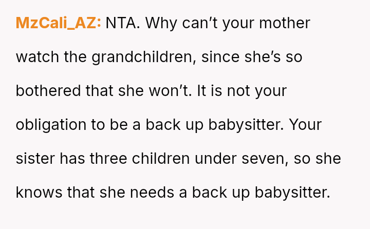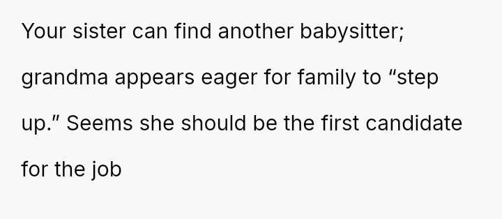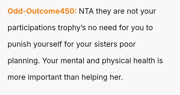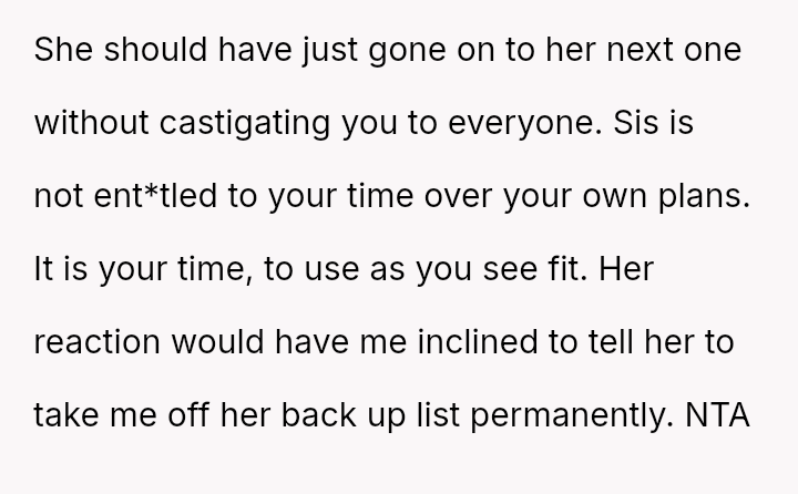 The OP prioritized their mental health and prior commitment, leading to accusations of selfishness from their sister and pressure from certain family members who believe family duty overrides personal plans.