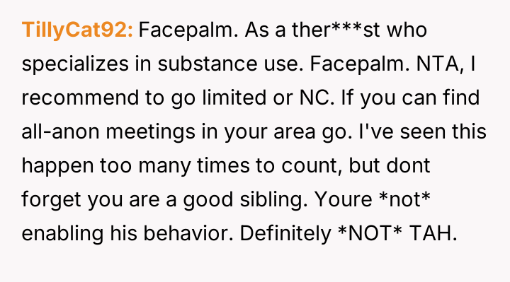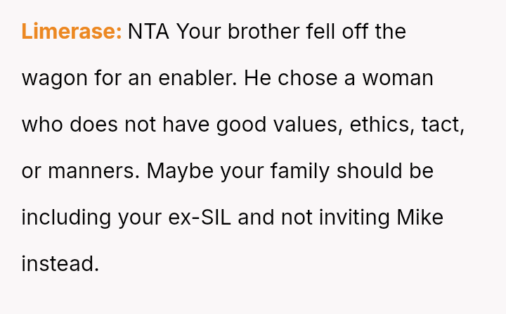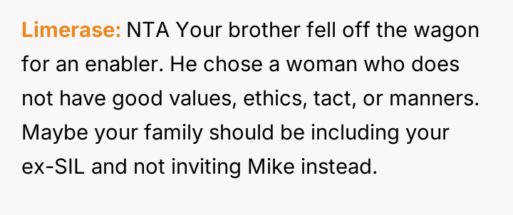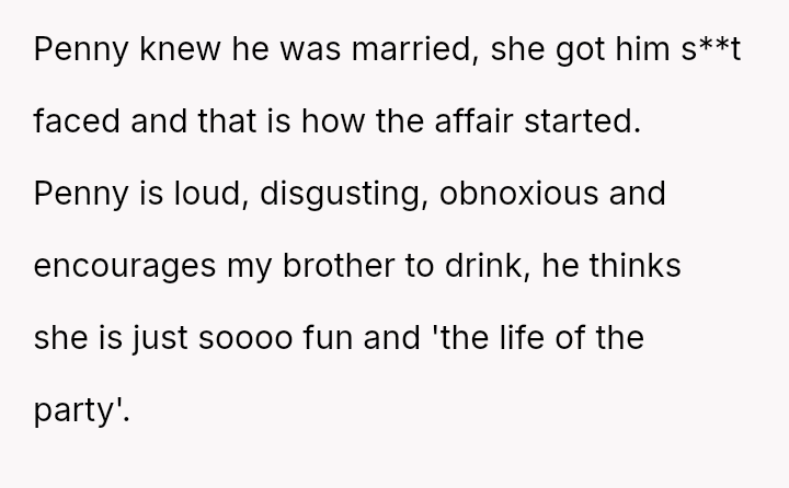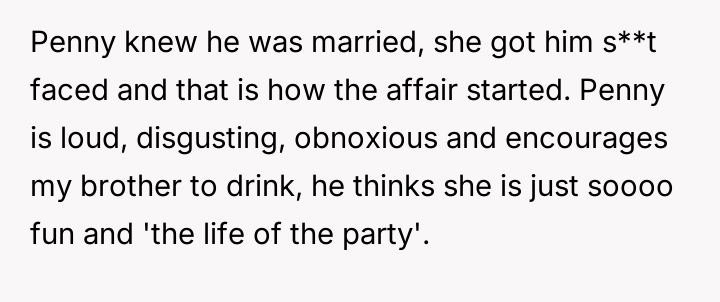 The original poster (OP) is deeply upset by her brother's behavior, particularly his disrespectful comments about his ex-wife and his choice to pursue a relationship with a woman who seems to encourage his past destructive habits.