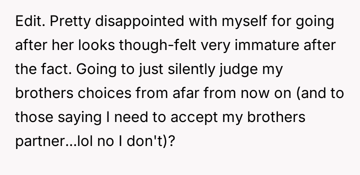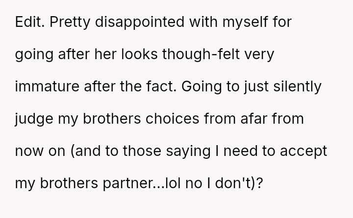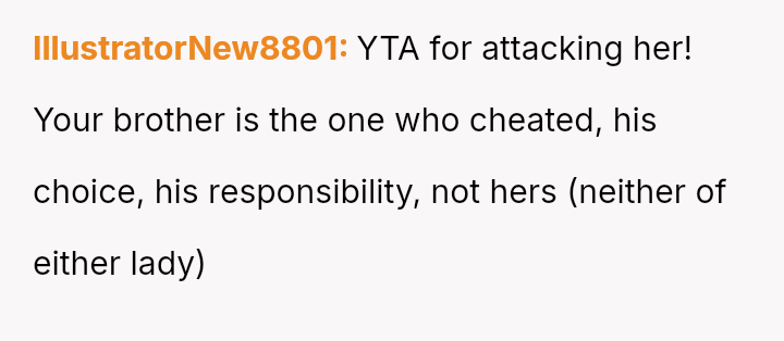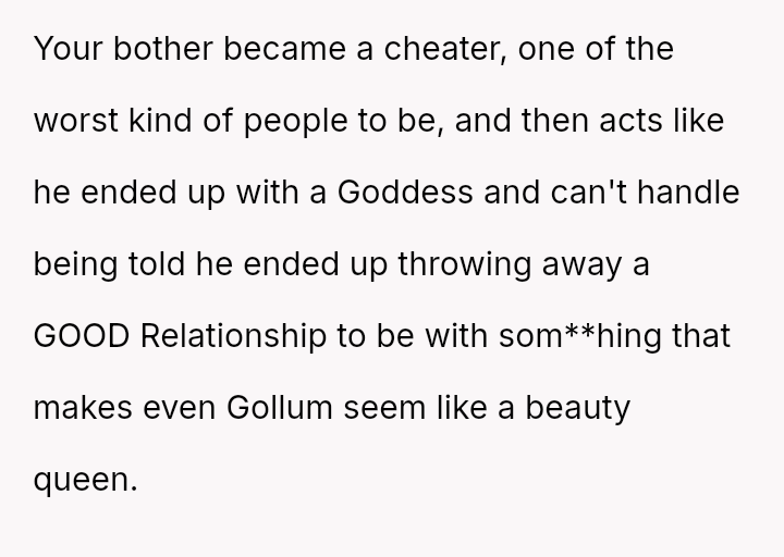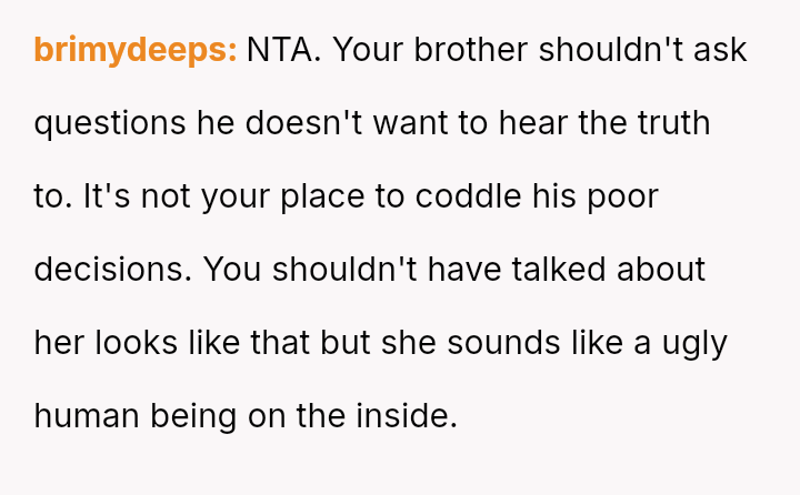 The core question for consideration is whether the OP was justified in protecting the memory of her ex-sister-in-law and condemning her brother's choices through direct, harsh confrontation, or if her intervention crossed the line into unacceptable personal attack, regardless of the validity of her observations about the new partner.
