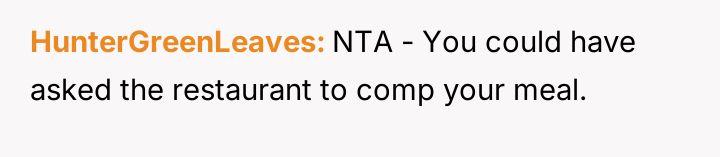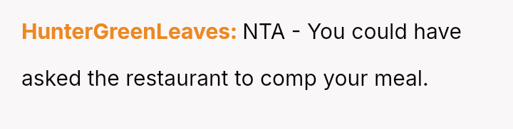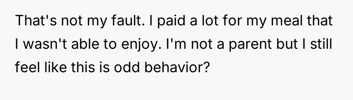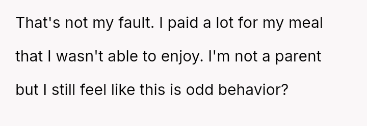 While the poster feels validated in their right to an undisturbed meal and points to the restaurant's lack of facilities as the root issue, they are struggling with the intensity of the other party's reaction.