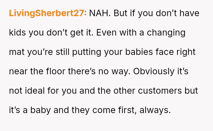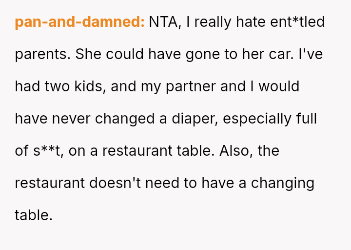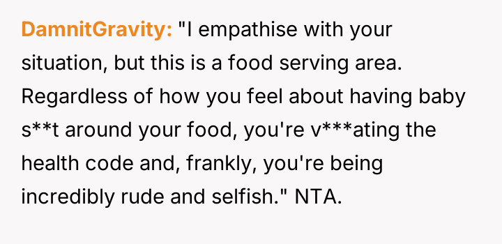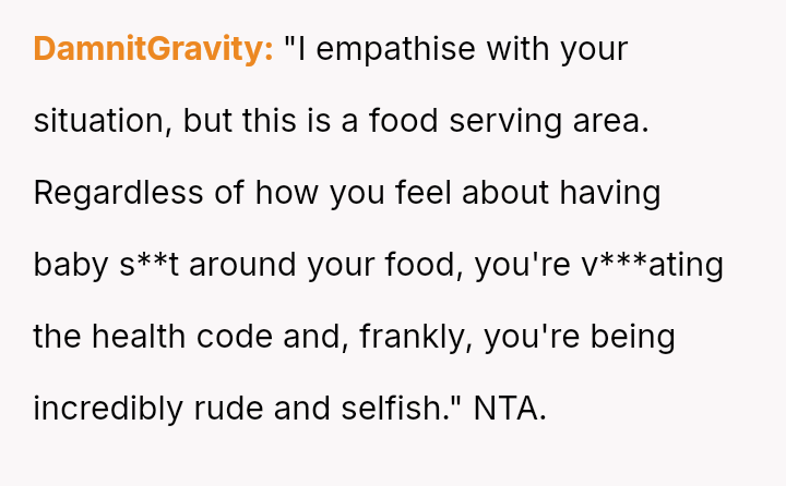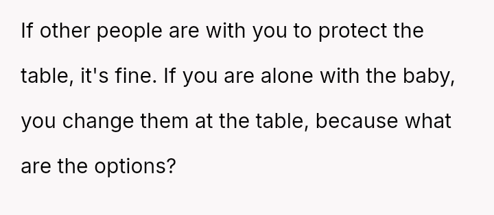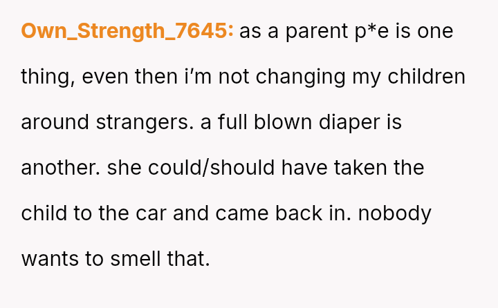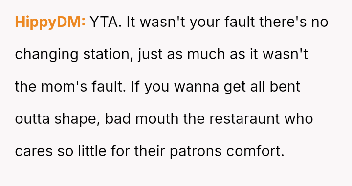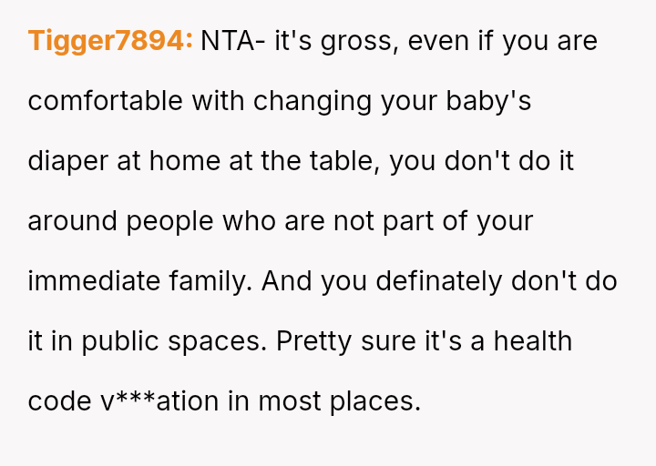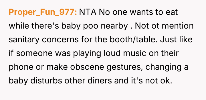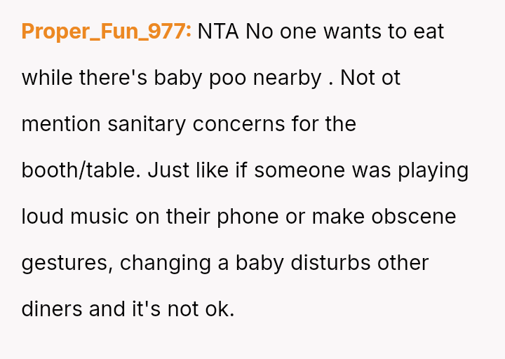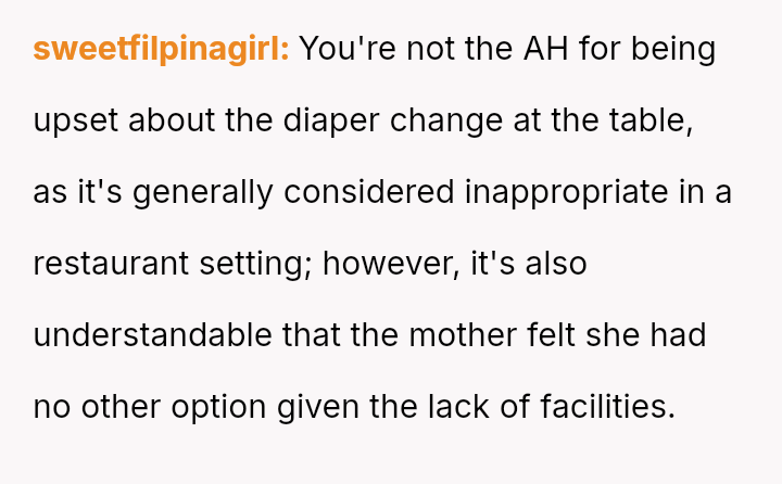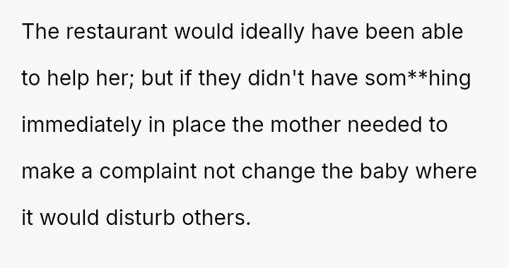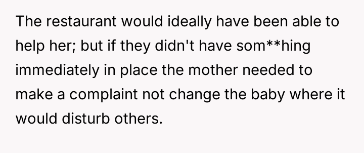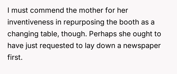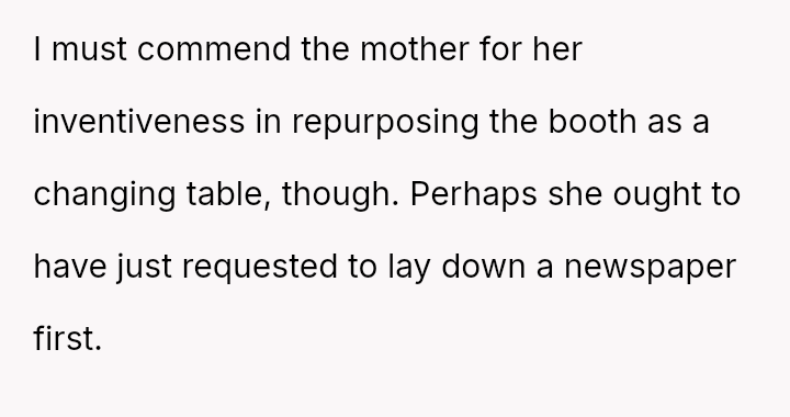 Given the lack of a dedicated changing facility, was the mother justified in using the booth space to care for her infant, or did the public nature of the act v***ate accepted social dining etiquette?