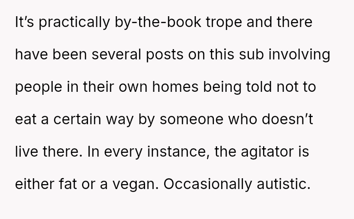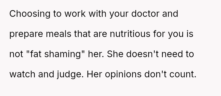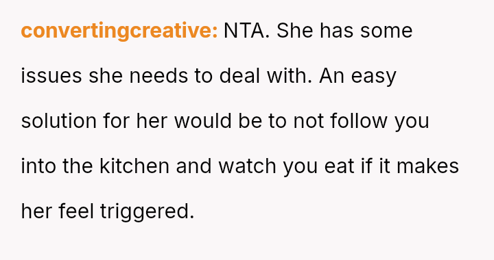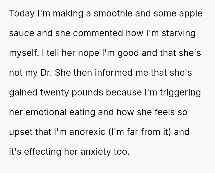 The original poster (OP) is facing a conflict where their es**blished, medically supervised d*etary choices are being challenged by their roommate's partner, who claims the OP's eating habits trigger her own emotional eating issues.