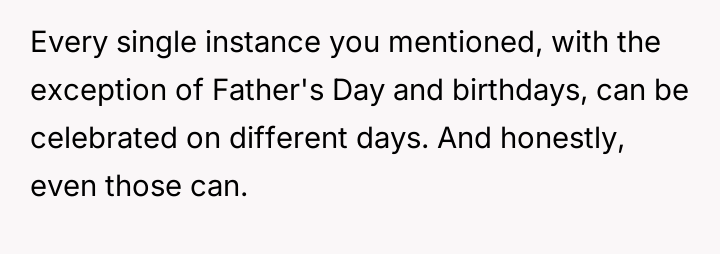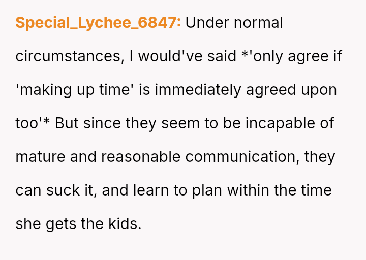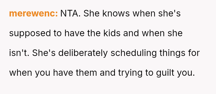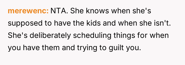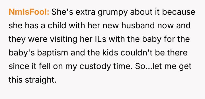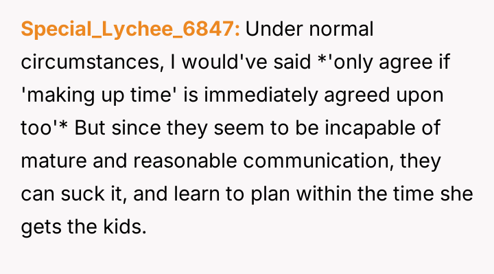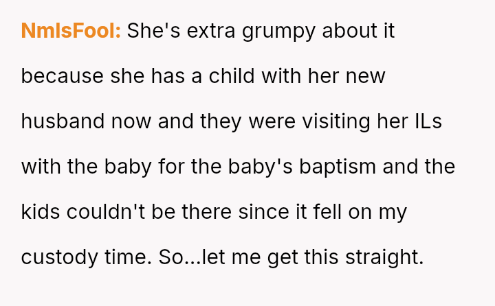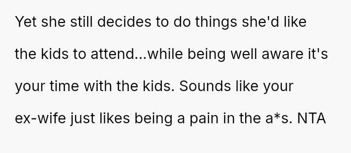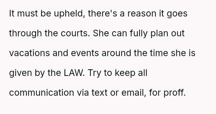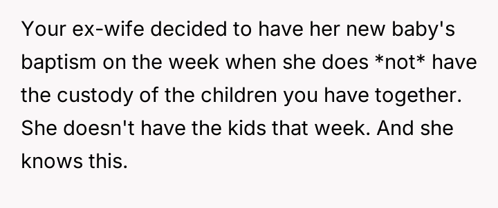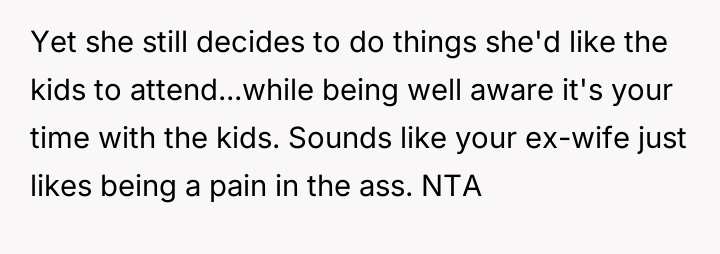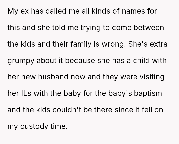 When the OP insists on adhering strictly to the court order, citing a past refusal by the ex-wife to negotiate makeup time, he faces anger and accusations that he is interfering with family events, leaving him questioning if his firm stance is unfair.