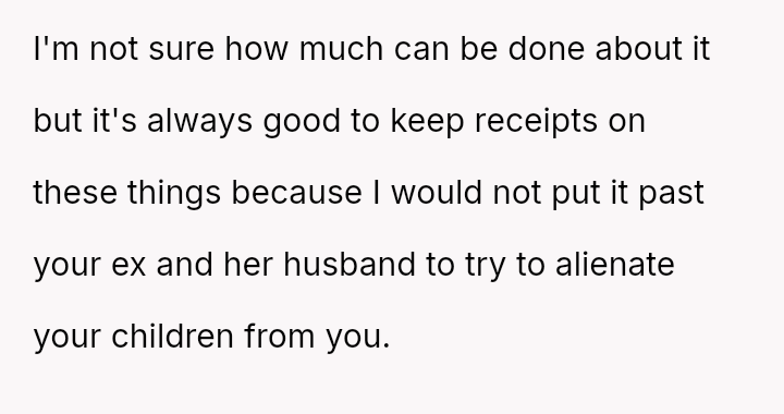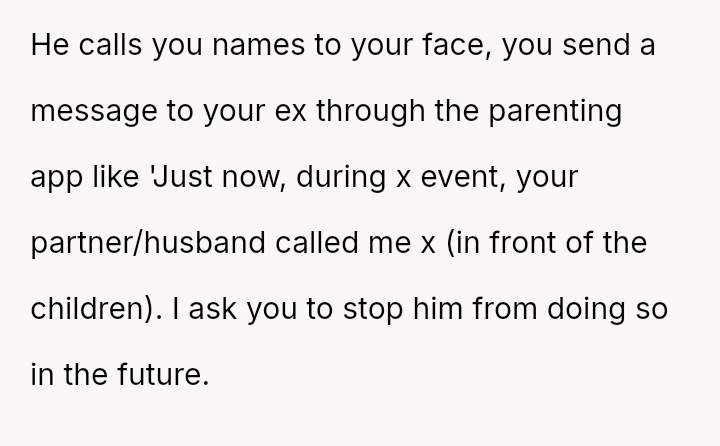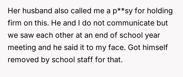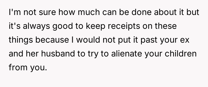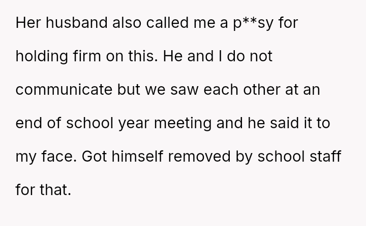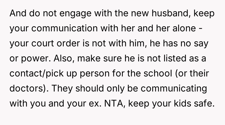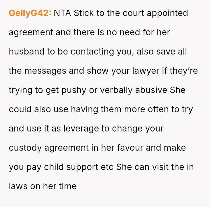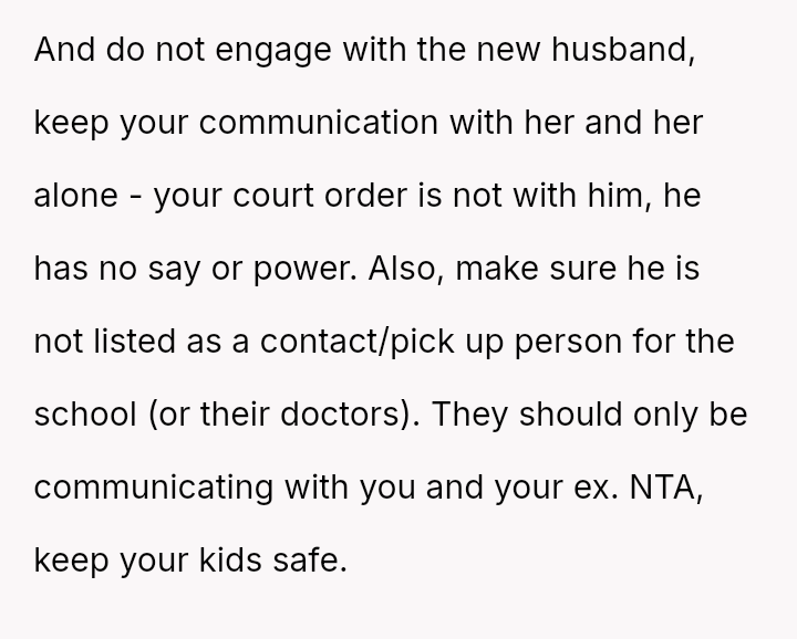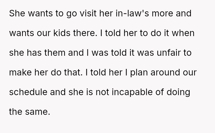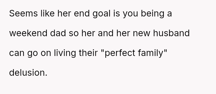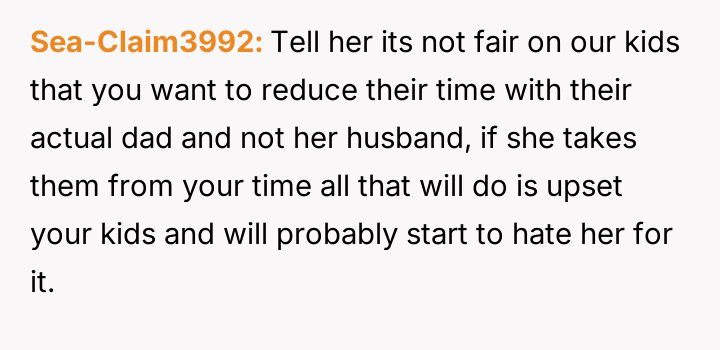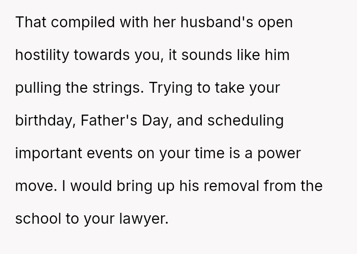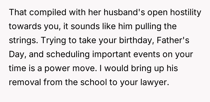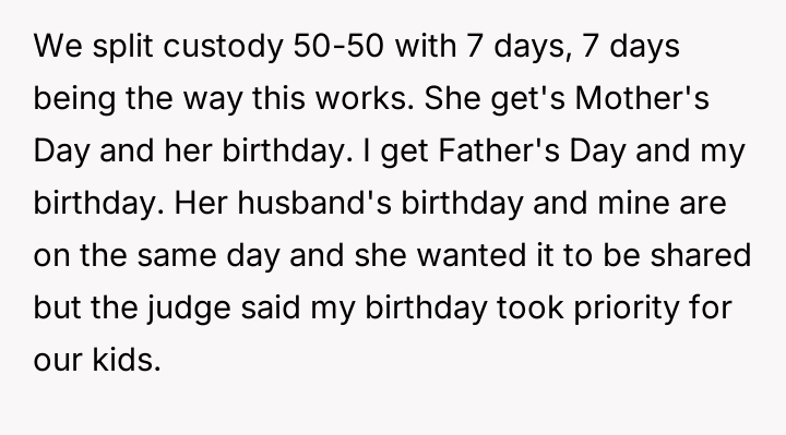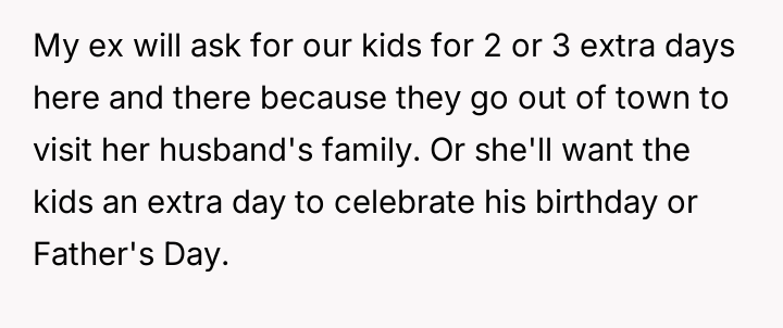 The ex-wife, remarried with a new child, frequently requests extra days with the children to accommodate visits with her current husband's family or to celebrate his birthday, which coincides with the OP's birthday and Father's Day.
