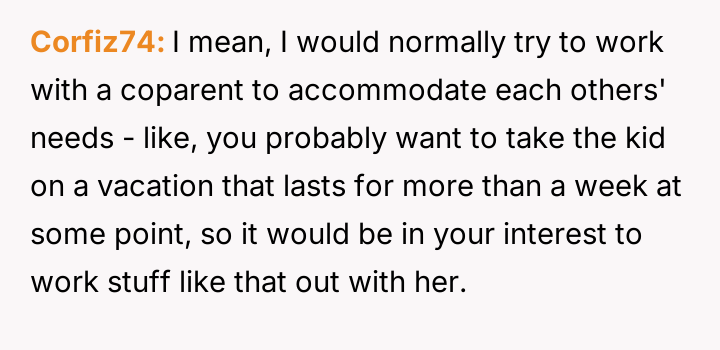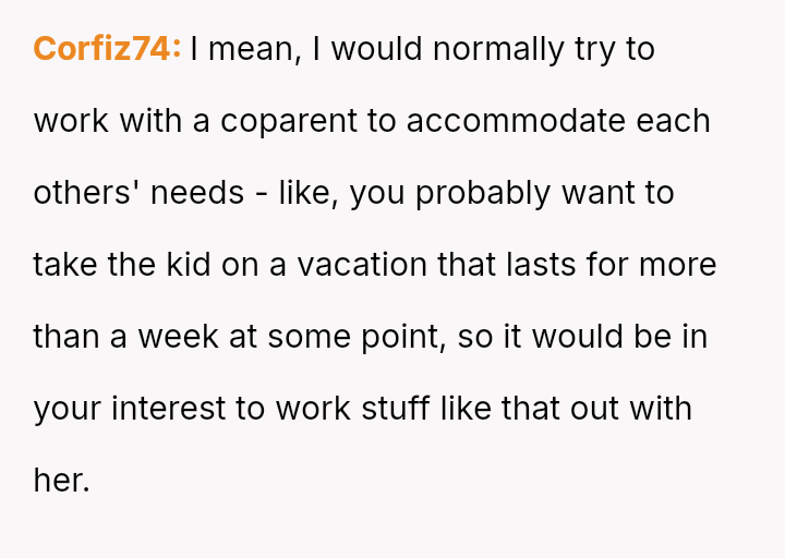 The central question is whether the OP is justified in rigidly enforcing the specific 7-day blocks of the custody order, even when it conflicts with the ex-wife's desire to include the children in extended family events, or if his refusal to be flexible, given the history, const*tutes an unreasonable obstacle to co-parenting.