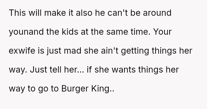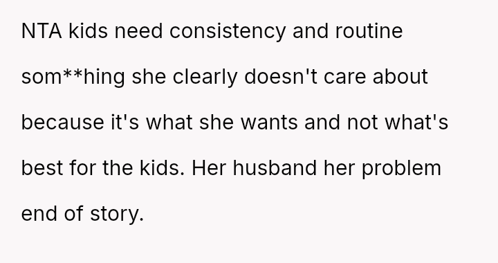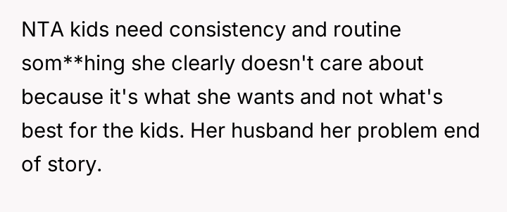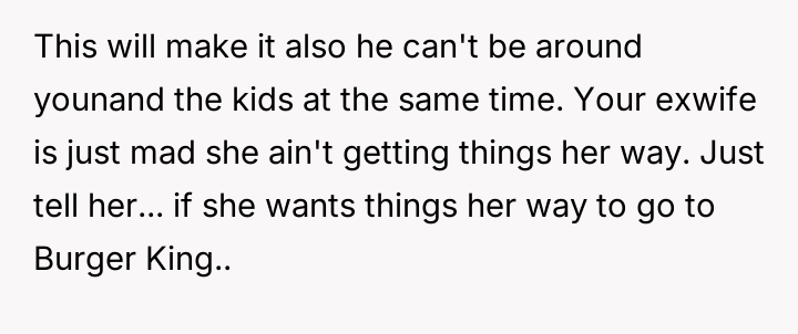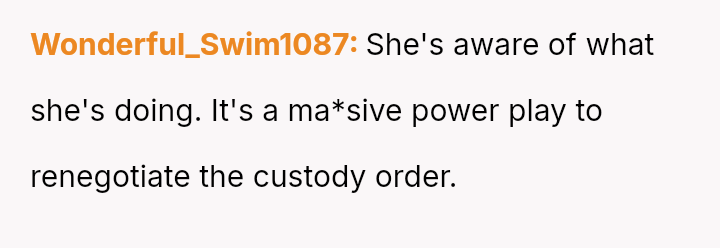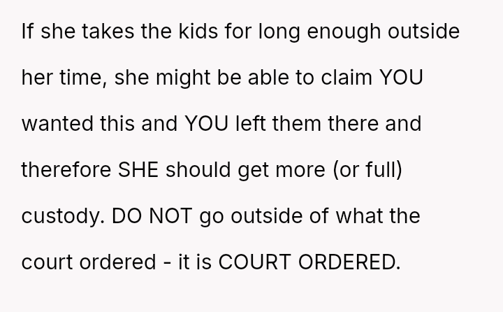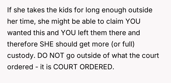 The original poster (OP), a man in his 30s, describes an ongoing conflict with his ex-wife regarding their court-ordered 50-50 custody schedule for their children, which mandates a 7-day on, 7-day off rotation.