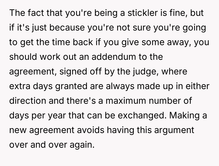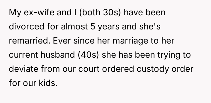 AITA for insisting my ex-wife and I stick to our court ordered custody order?