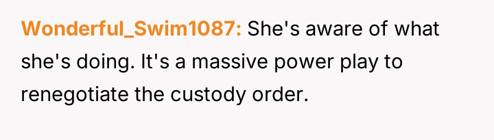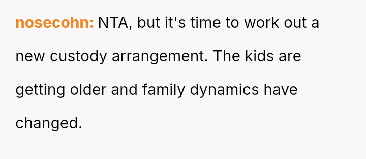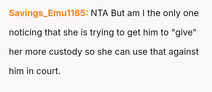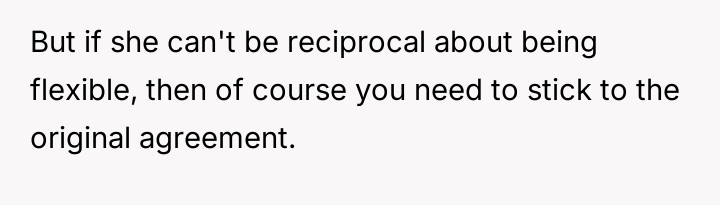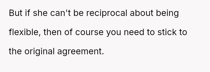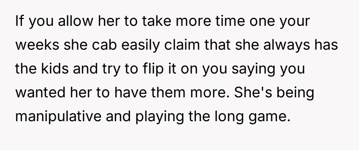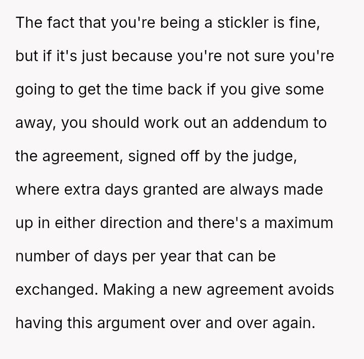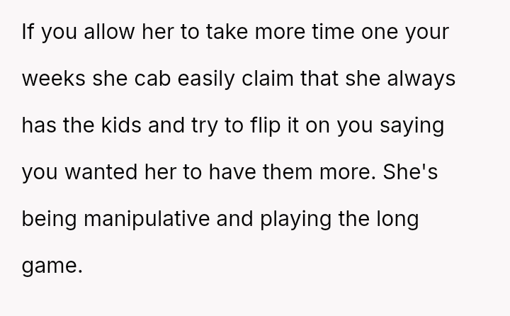 The poster is under significant emotional pressure due to repeated demands from his ex-wife to alter the es**blished custody schedule, which he perceives as attempts to gain extra time without guaranteeing reciprocity.