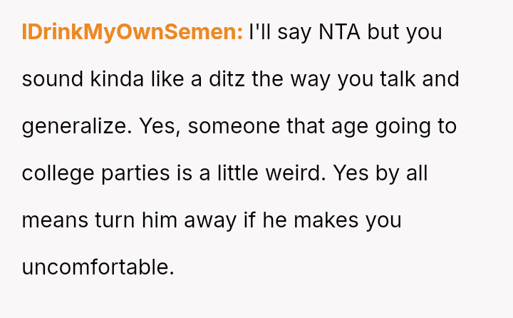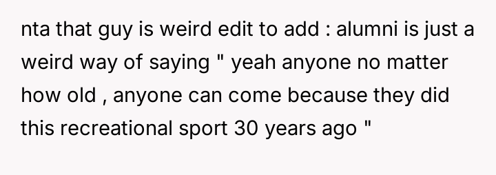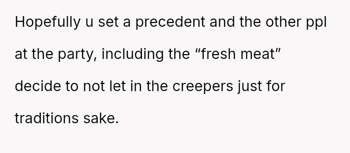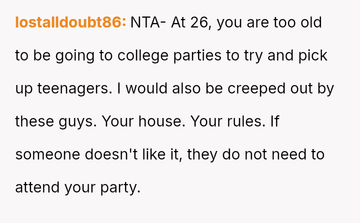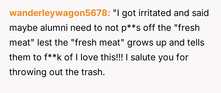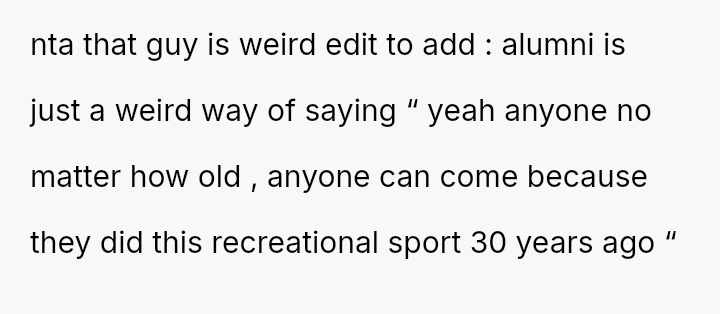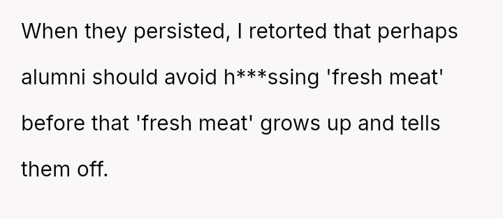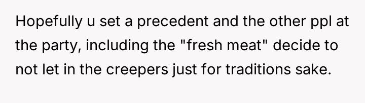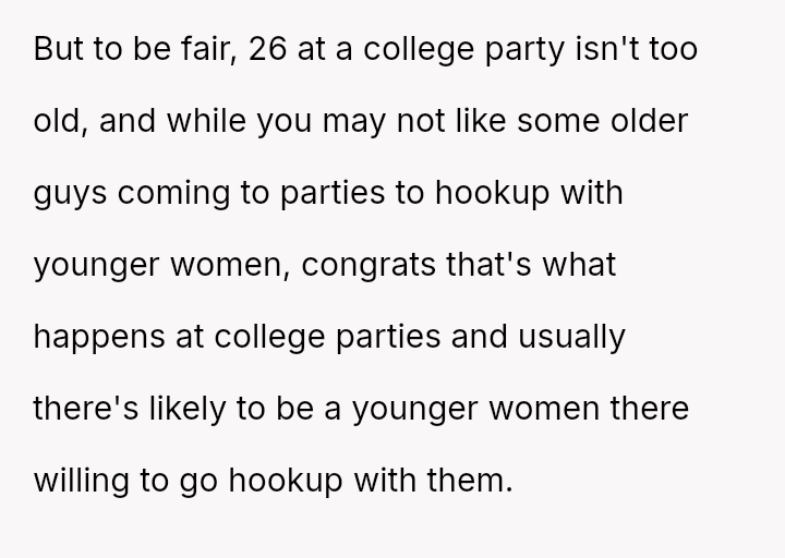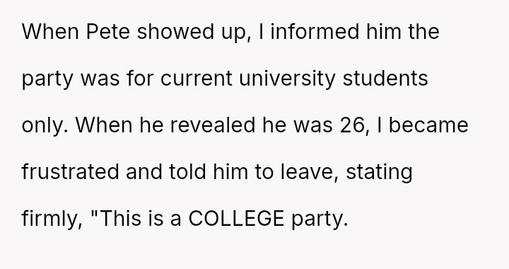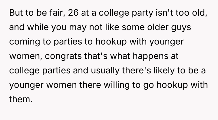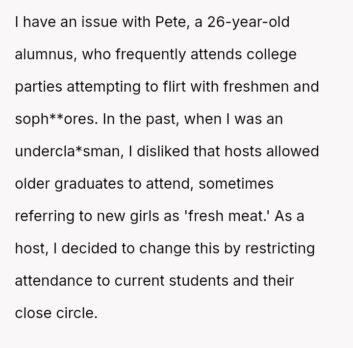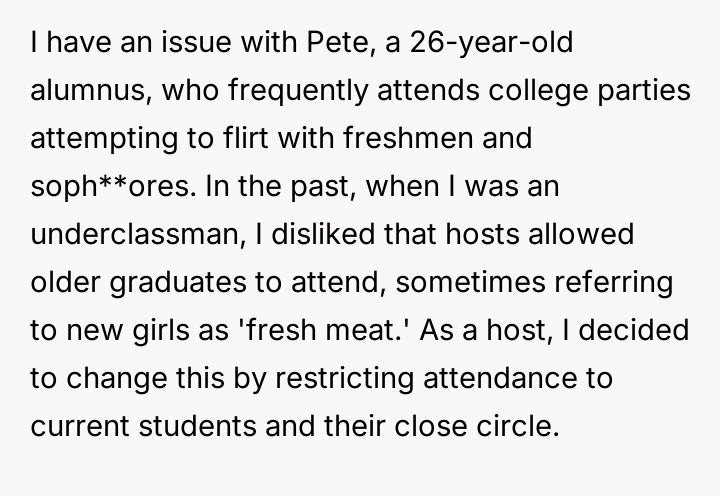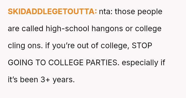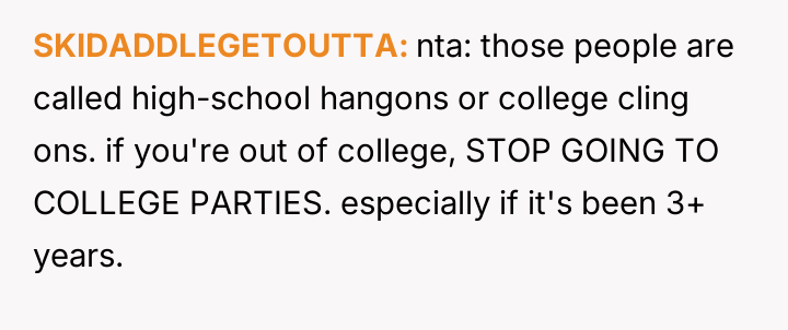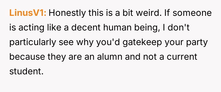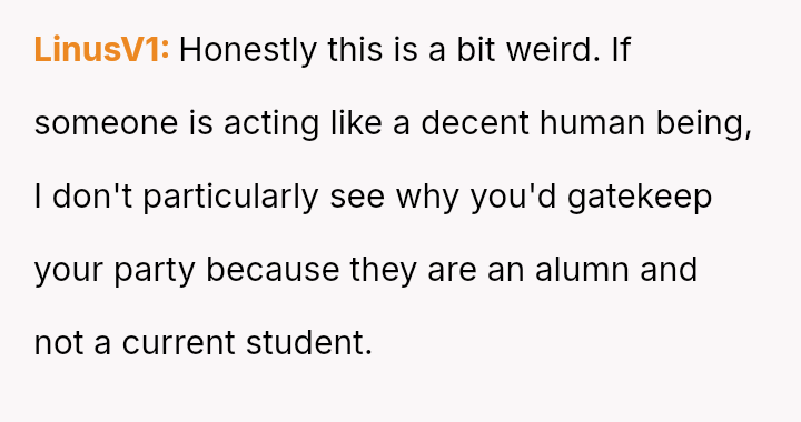 The original poster (OP) experienced frustration with past party dynamics where older, graduated alumni who were no longer students frequented college parties, often making younger members uncomfortable.
