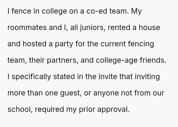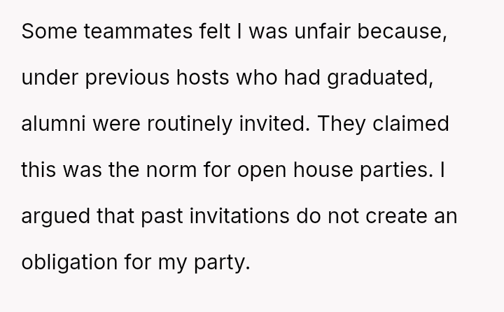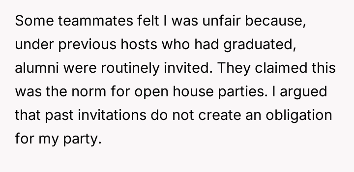 This action directly conflicted with the es**blished, albeit unspoken, tradition upheld by some current teammates who expected the party to remain open to recent alumni, leading to disagreement over the host's right to set guest limitations.