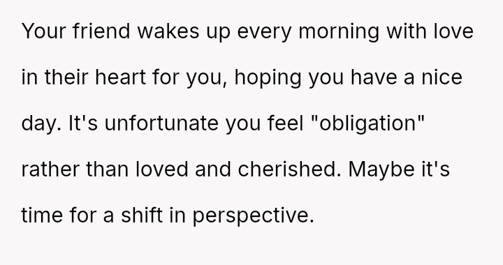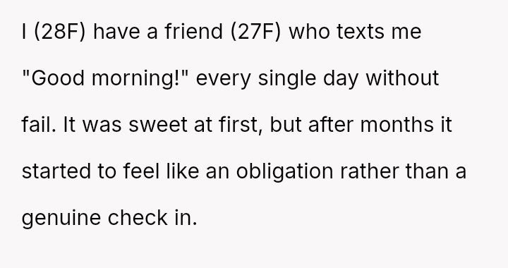 The original poster experienced significant emotional fatigue from a daily communication requirement imposed by a friend's morning texts, leading to a feeling of obligation rather than genuine connection.