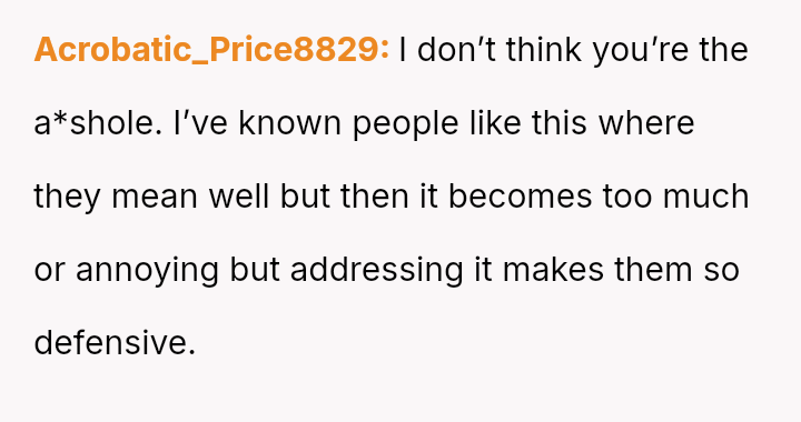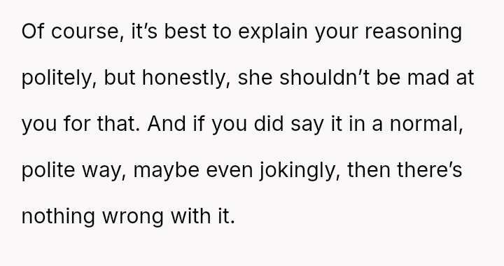 When the poster attempted to set a boundary to reduce this pressure, the friend reacted with upset and accusations of unkindness, creating a conflict between the poster's need for personal space and the friend's interpretation of her gesture as obligatory kindness.