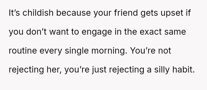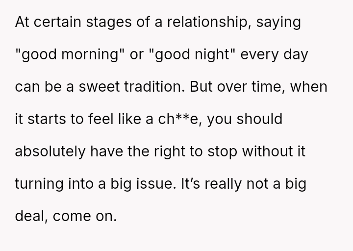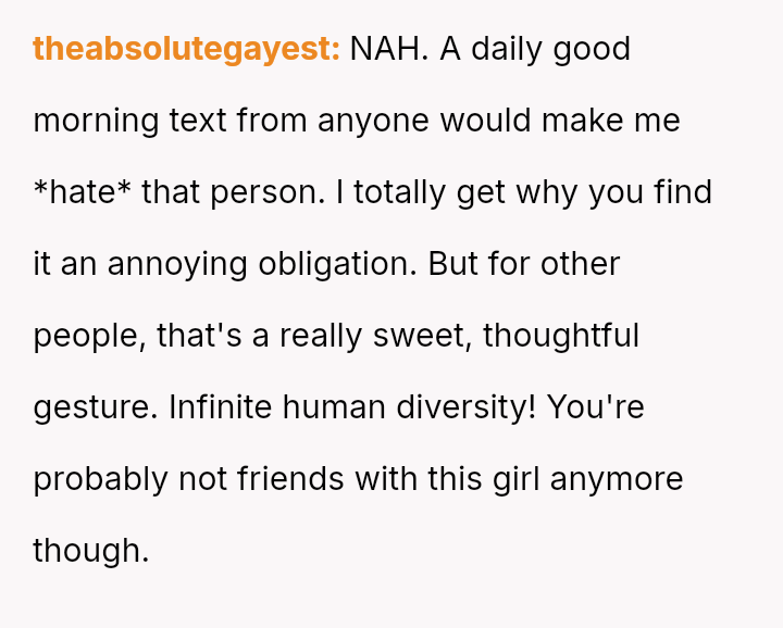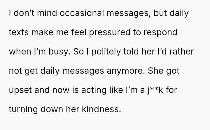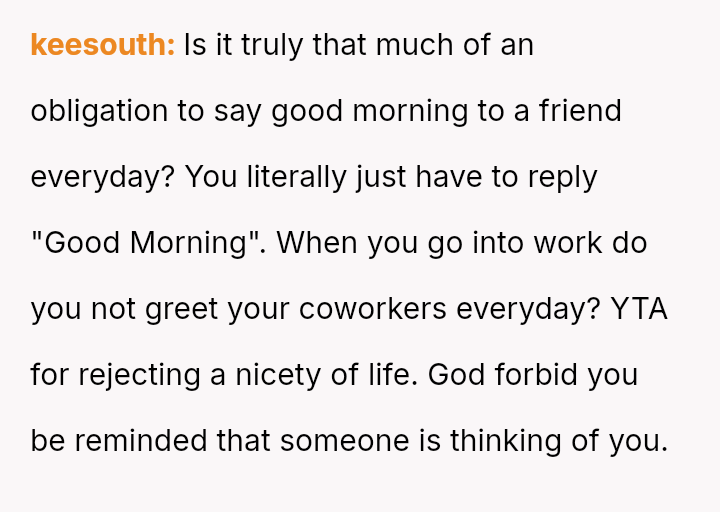The central question remains whether the poster was justified in prioritizing their mental peace by es**blishing a communication boundary, even if it caused temporary distress to the friend, or if declining a simple, daily gesture of affection const*tutes an unfair rejection of their friendship.