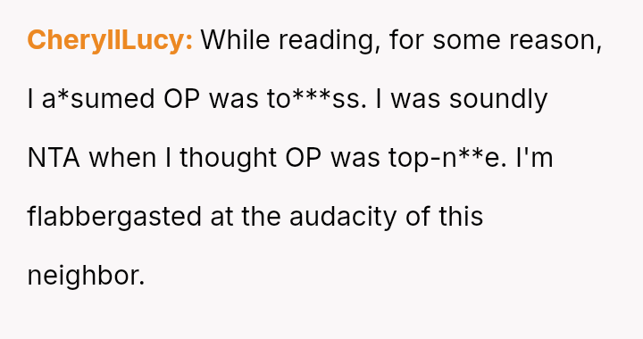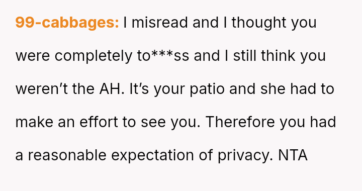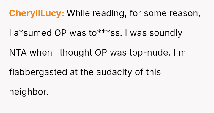 Given the v***ation of privacy and the inappropriate nature of the neighbor's comments, was the poster's strong reaction justified as a necessary defense of her boundaries, or would ignoring the intrusion, as the husband suggested, have been the more constructive path to maintaining neighborhood peace?