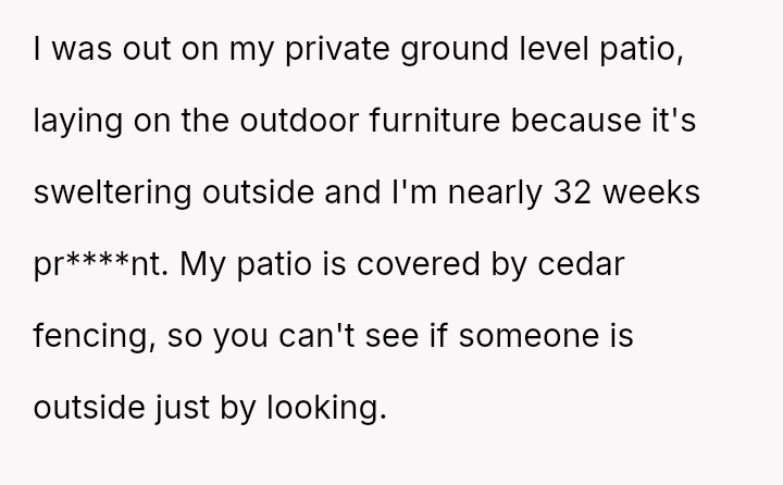 In the heavy heat of a relentless summer day, a nearly 32-week pr****nt woman sought solace on her private patio, craving only peace amid the sweltering air.