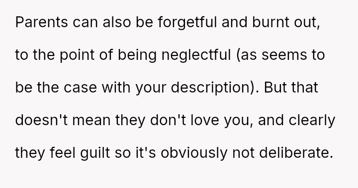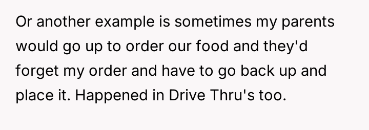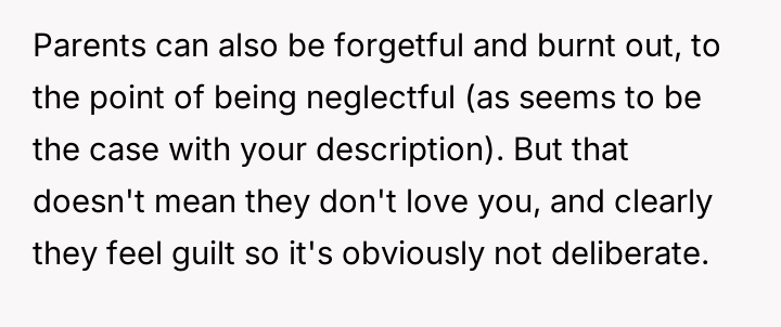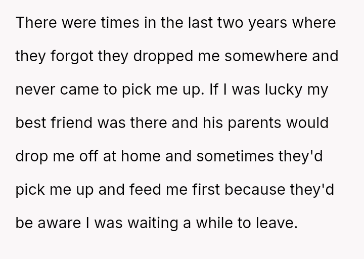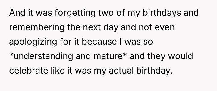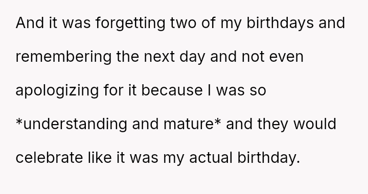 This pattern included small incidents like being forgotten when choosing treats or having his food order missed, escalating to more serious issues such as forgotten homework help, missed pickups, and even two forgotten birthdays.