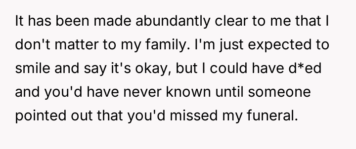 AITA for asking my parents how long it would take them to notice if I d*ed or would they even notice at all after they ignored 6 hours of calls about me going to the emergency room?