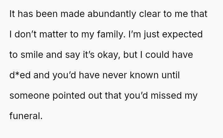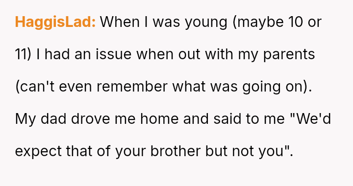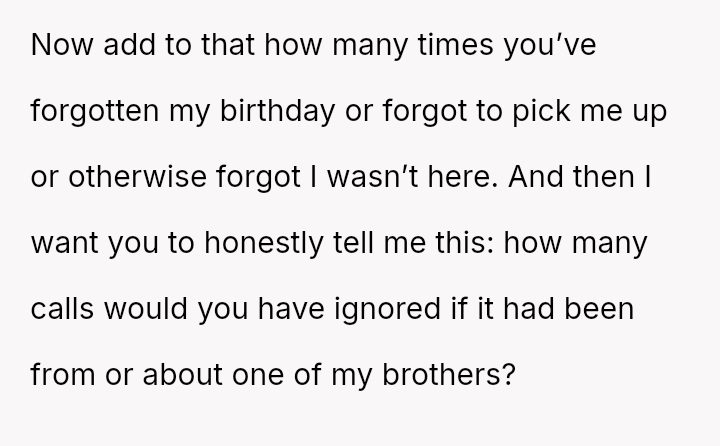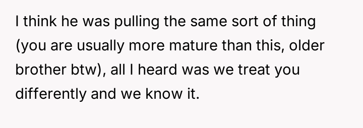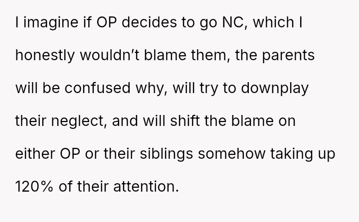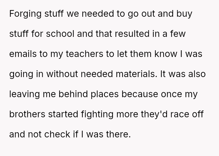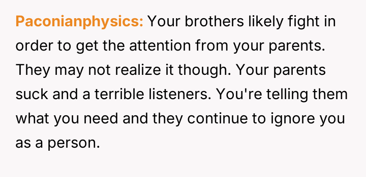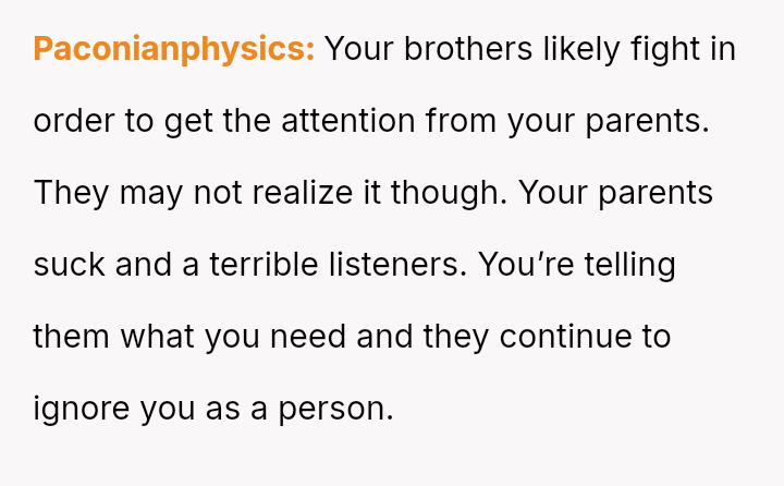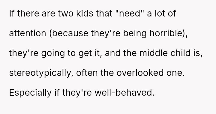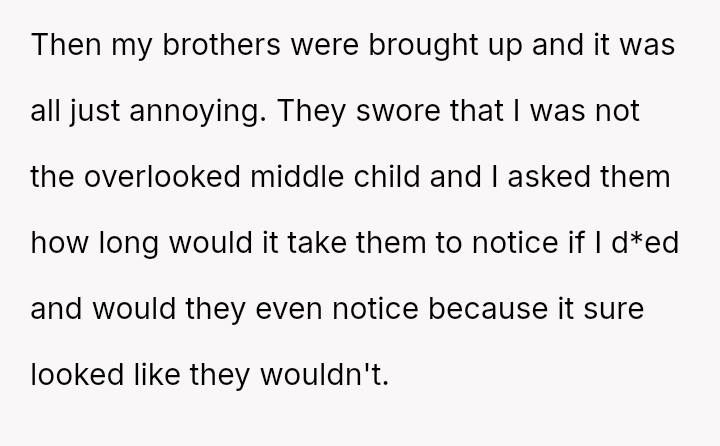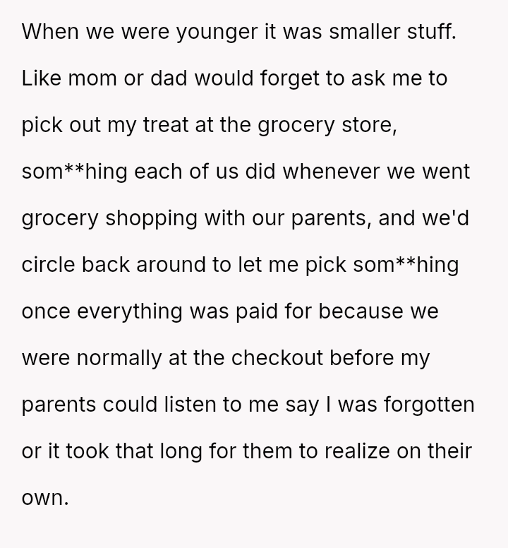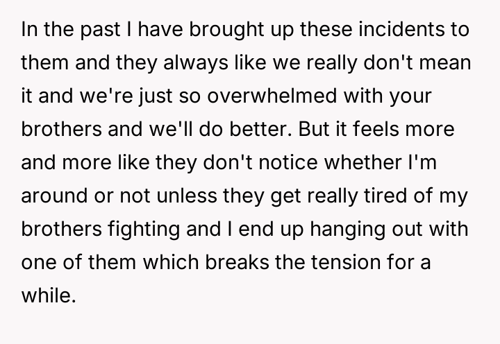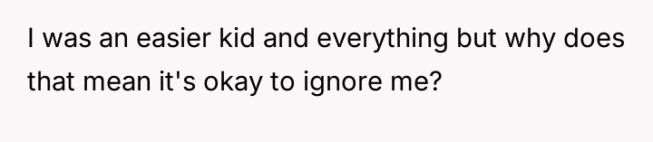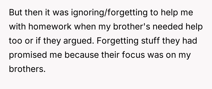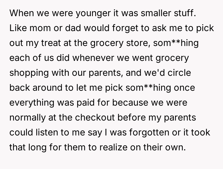 He notes that while his parents often use the ongoing conflict between his older and younger brother as an excuse for being distracted, the pattern of being forgotten or ignored started early.