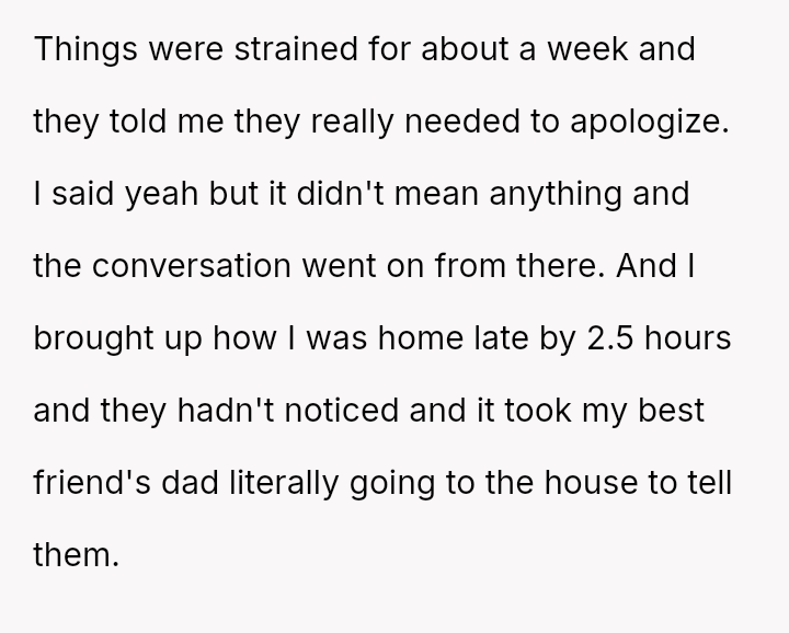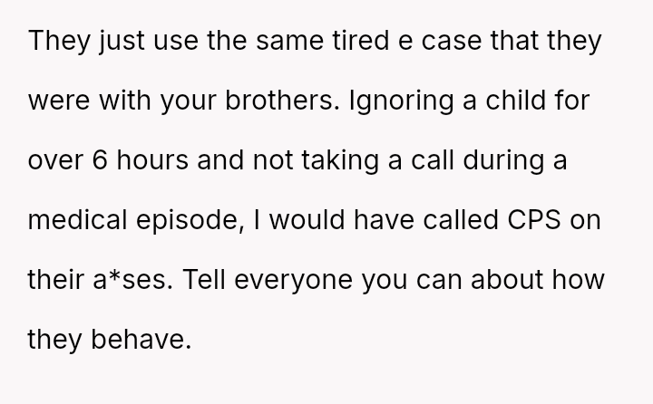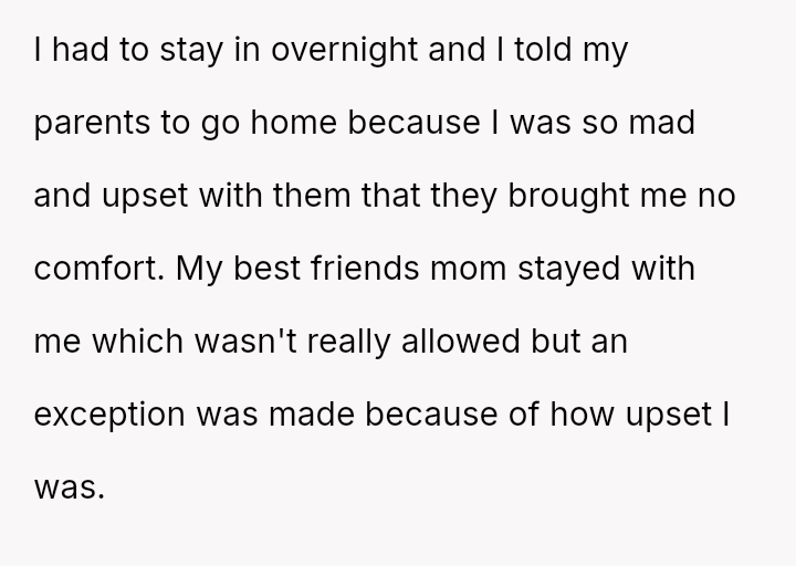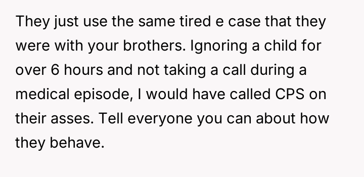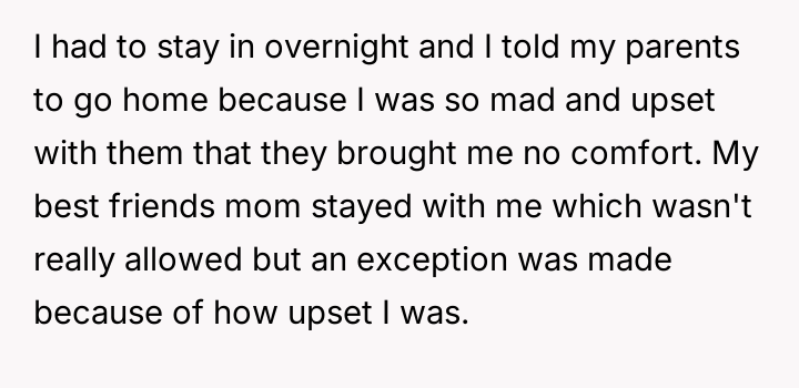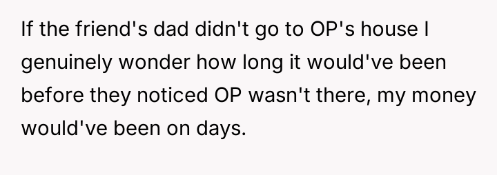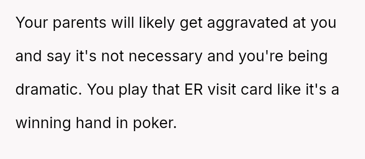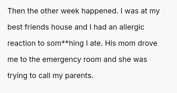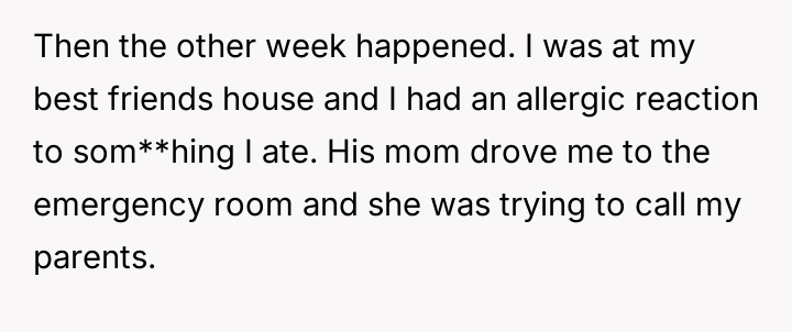 The situation reached a critical point when the original poster (OP) had a severe allergic reaction and was taken to the emergency room, where his parents took over seven hours to arrive after being notified by his friend's father, causing the OP to seriously question if they would notice his absence.