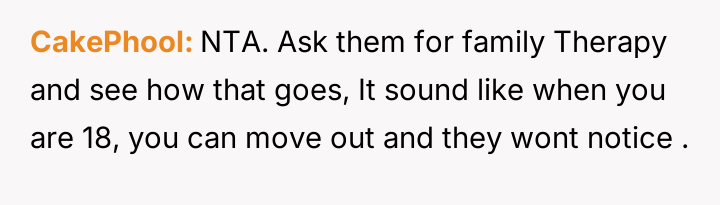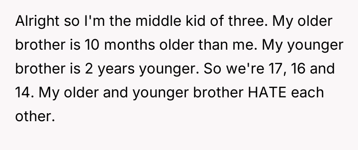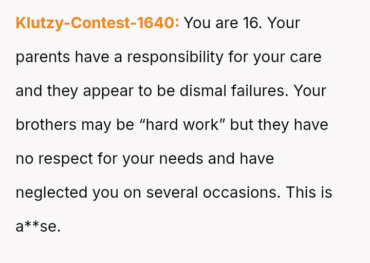 The individual, a 16-year-old male, describes a long history of feeling overlooked by his parents compared to his two brothers, who are 17 and 14.