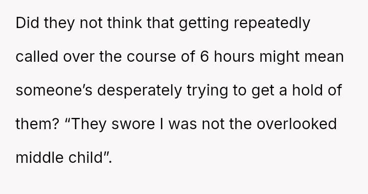 The central conflict revolves around the OP's deep-seated feeling of parental neglect, which he feels has been consistently validated by repeated instances of being forgotten or overlooked, culminating in the alarming delay in response during his medical emergency.