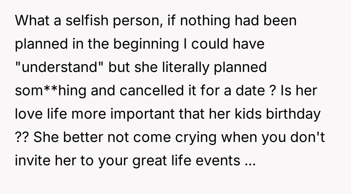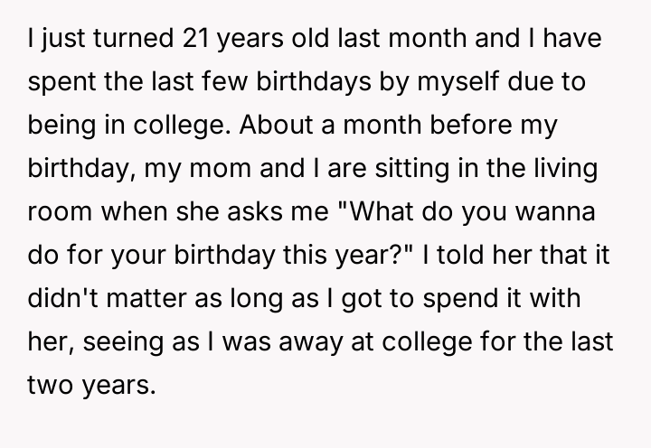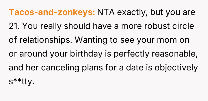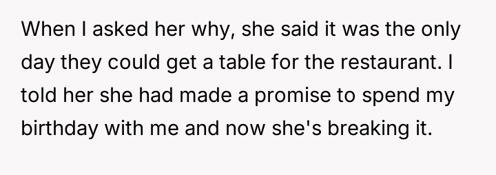 The original poster (OP) felt deeply let down by their mother, who canceled a promised birthday celebration for a date with her boyfriend.