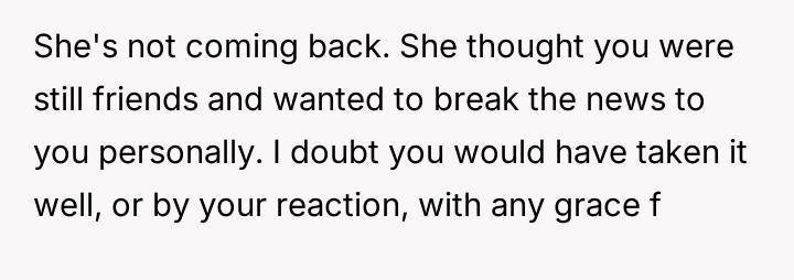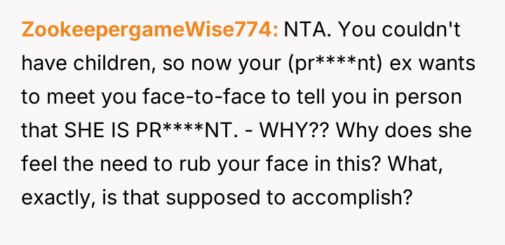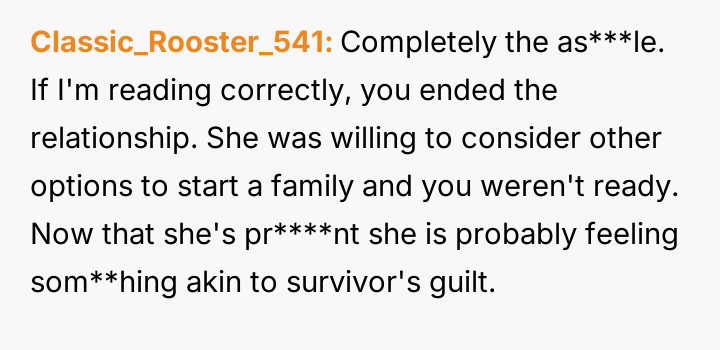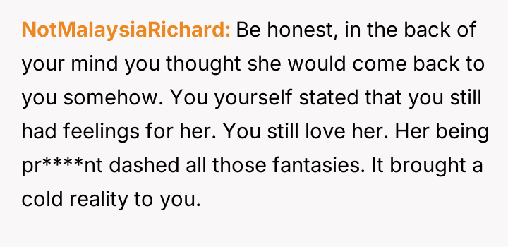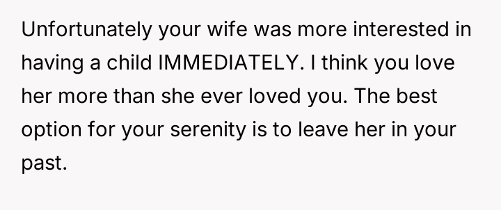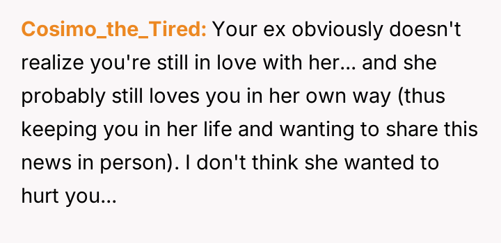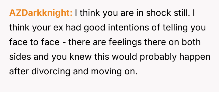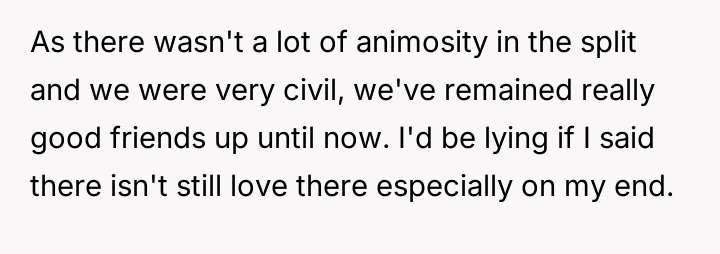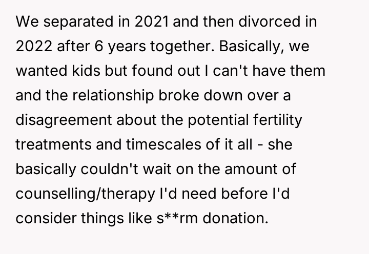 The original poster (OP) is dealing with significant emotional fallout after learning that his ex-wife, with whom he maintained a close friendship despite their divorce over fertility issues, is pr****nt by another man.