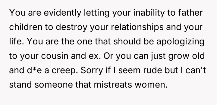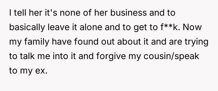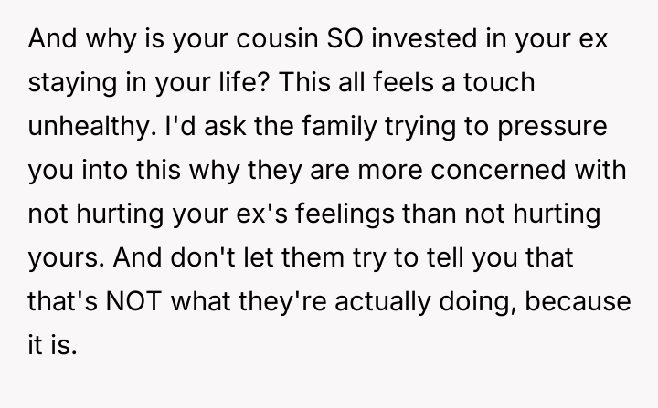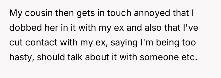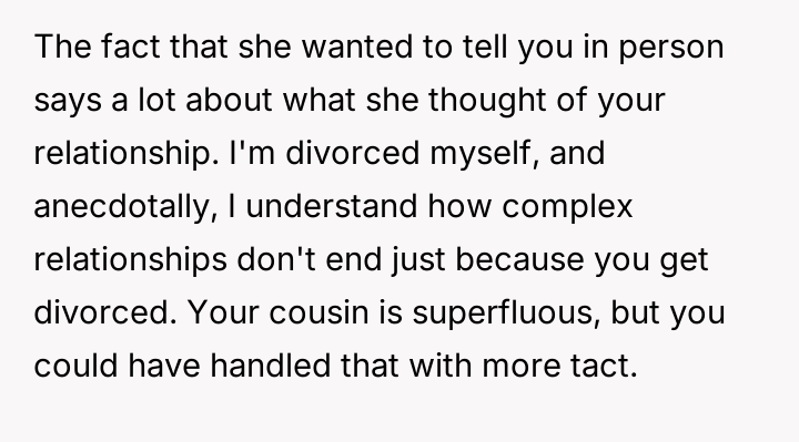Considering the OP's strong emotional reaction versus the desire to preserve relationships and handle sensitive information appropriately, the core question remains: Was abruptly severing ties with both his ex-wife and his mediating cousin the necessary action to protect his emotional well-being, or did it unjustly escalate a difficult situation that required nuanced communication?