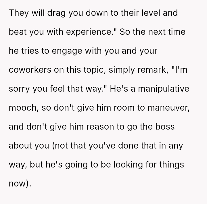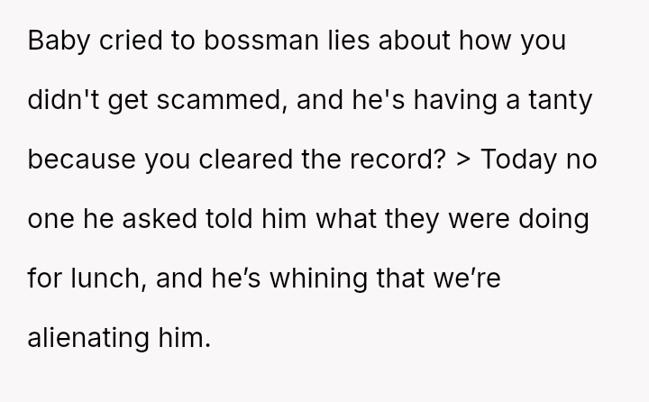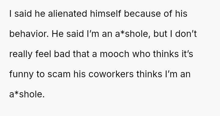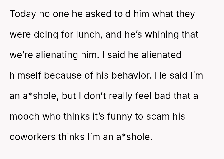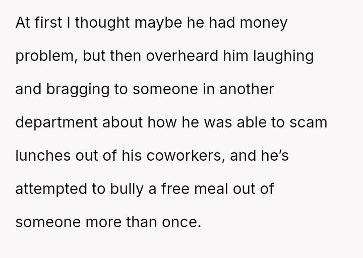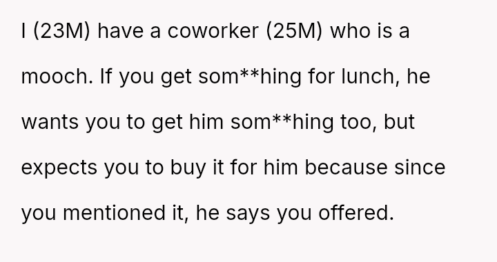The 23-year-old coworker, blindsided by the brazen audacity of a colleague who believes lunch should always come at someone else’s expense, wrestles with frustration and disbelief as he uncovers the truth behind the mooch’s smiling facade.