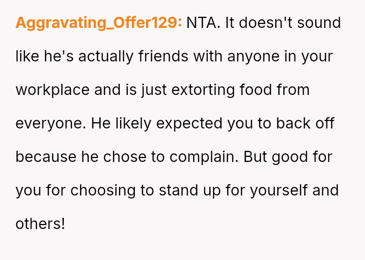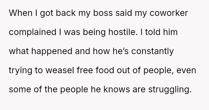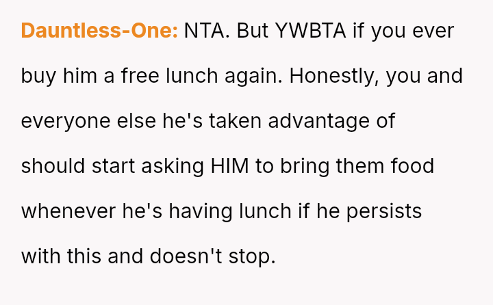 The original poster (OP) clearly felt burdened and disrespected by the coworker's persistent behavior of expecting free items, which culminated in a confrontation over lunch arrangements.