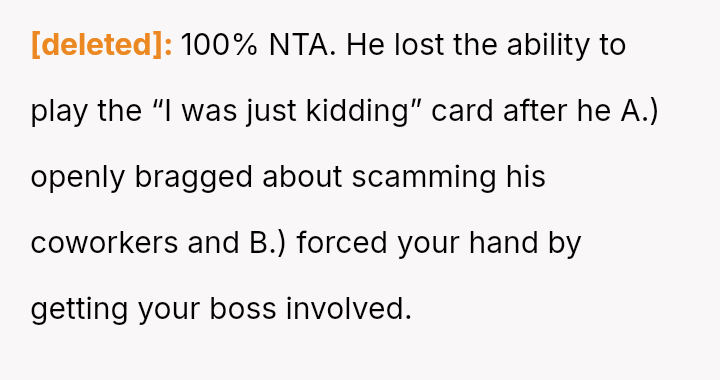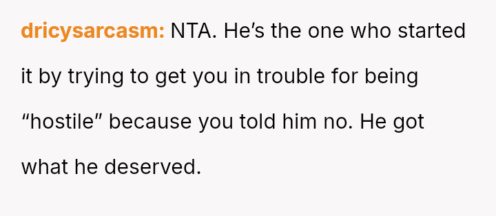 The central conflict lies between the OP's desire to es**blish firm boundaries against being taken advantage of and the coworker's expectation that his ent*tled demands should be met without consequence, leading to the coworker feeling victimized after his actions were reported to management.