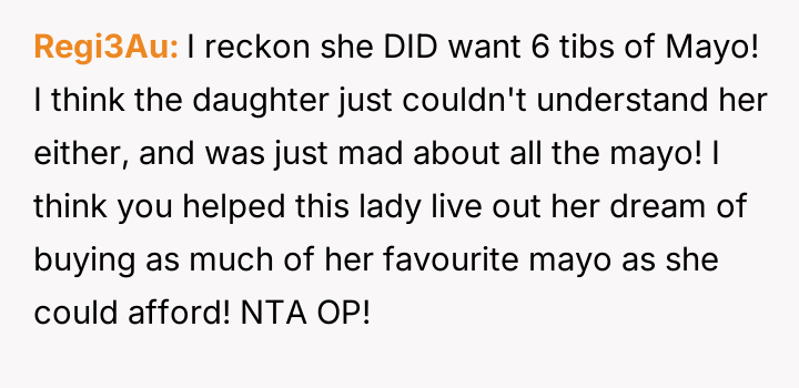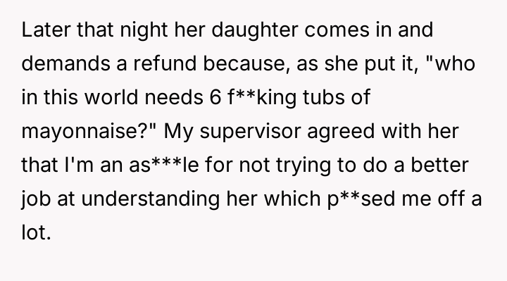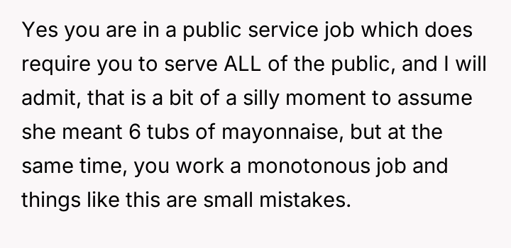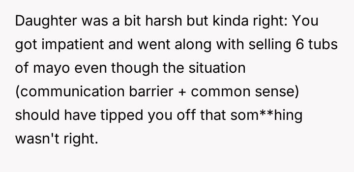 AITA for “forcing” a disabled woman to buy 6 tubs of mayo?