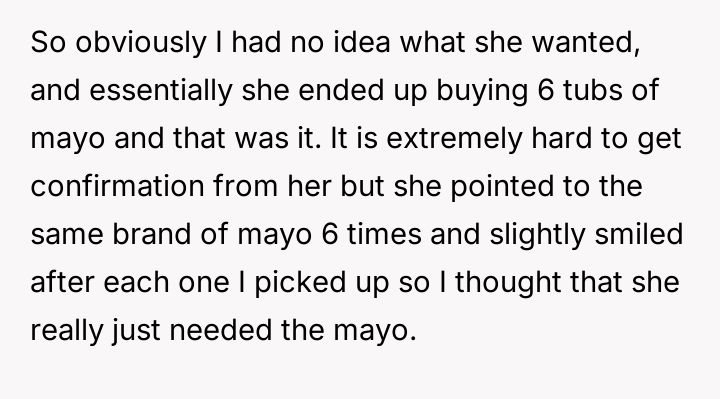 The original poster (OP) faced a challenging situation where they attempted to assist a customer with severe physical and communication disabilities, resulting in an unintended purchase of six tubs of mayonnaise.