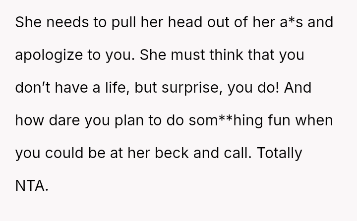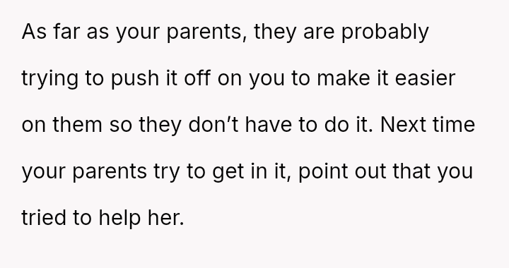 His decision to stop all babysitting has created a major conflict, leading to verbal a**se from his sister and pressure from his parents to conform to the expectation that family must always provide free, on-demand support.
