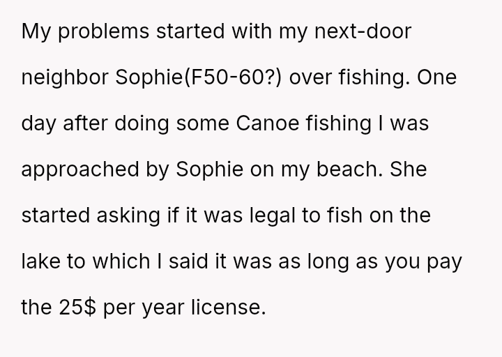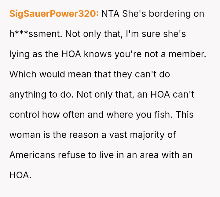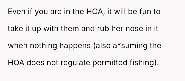 Given the neighbor's escalation from polite inquiry to formal HOA involvement, is the OP justified in viewing the fishing restriction as a private matter that does not warrant engagement, or did their dismissive reaction forfeit any chance of a respectful, diplomatic resolution with the neighborhood a*sociation now involved?