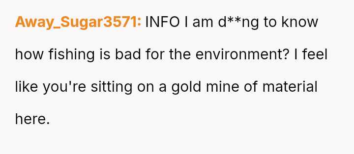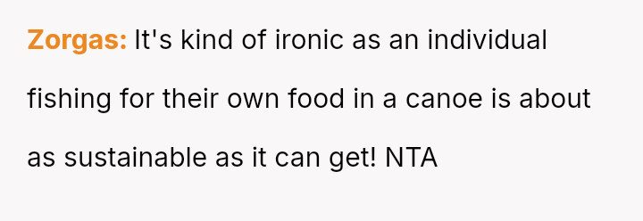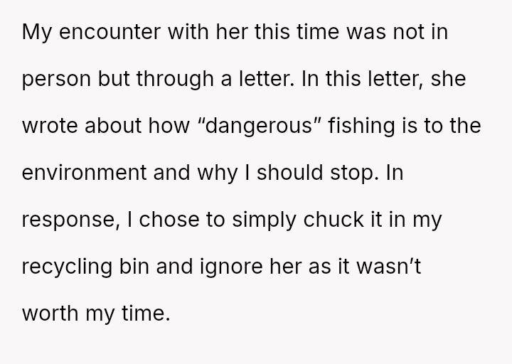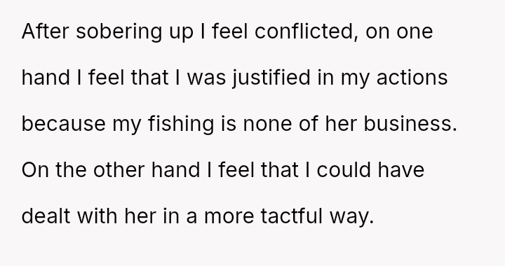 The original poster (OP) feels conflicted, believing their right to fish on their property is being unfairly challenged by a neighbor who objects on environmental grounds.