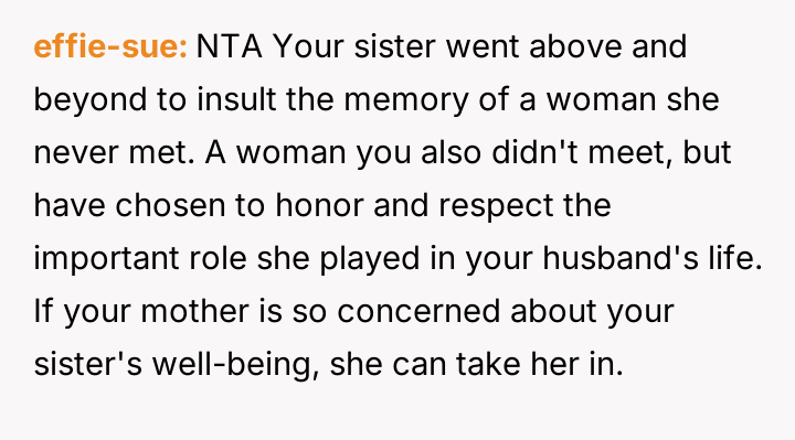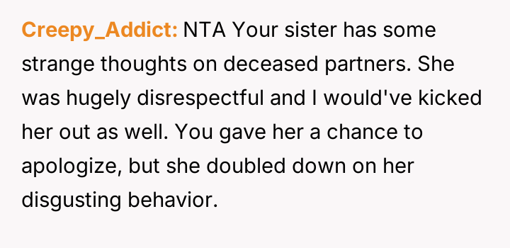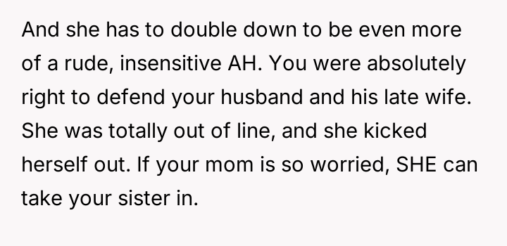 Was the OP justified in immediately evicting her sister for the extreme disrespect shown toward her husband's deceased wife, even given the sister's vulnerable housing situation, or did this reaction const*tute an overly harsh punishment for an insensitive outburst?"
