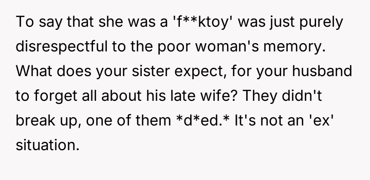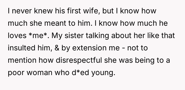 The original poster (OP) felt deeply disrespected and compelled to defend her husband's deceased first wife and their shared history after her sister used vulgar and insulting language regarding the photo.