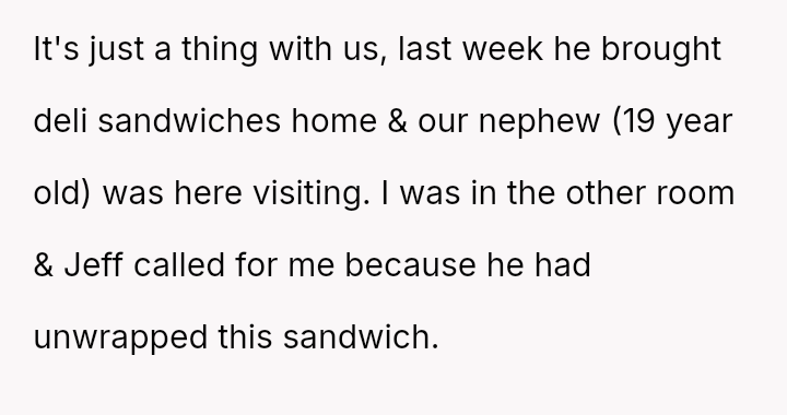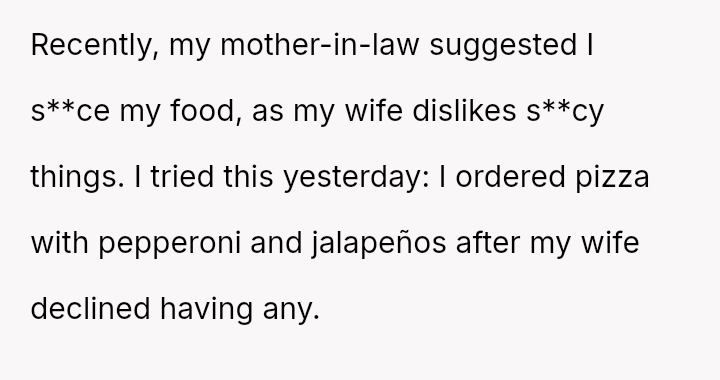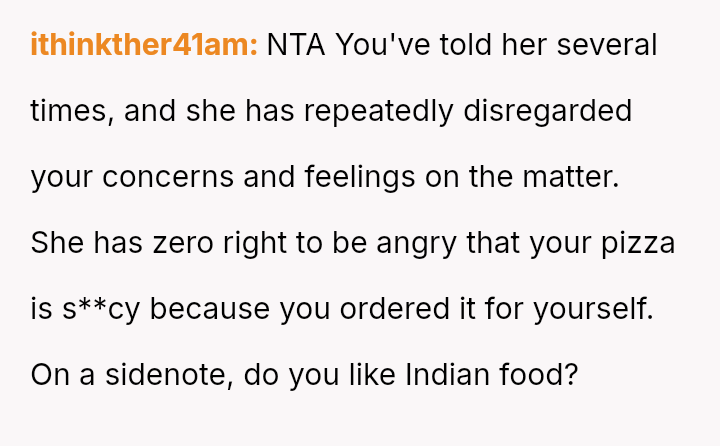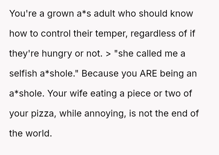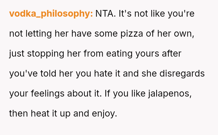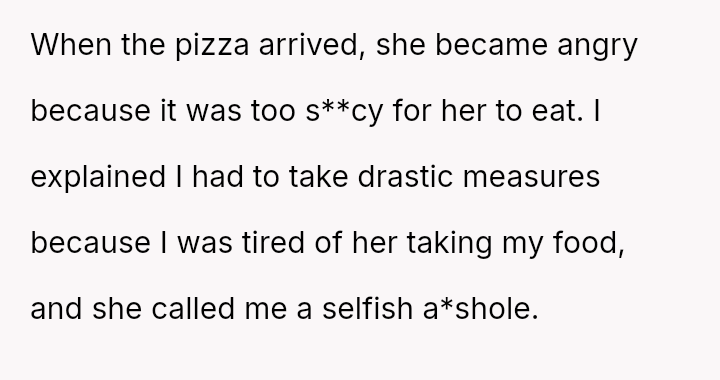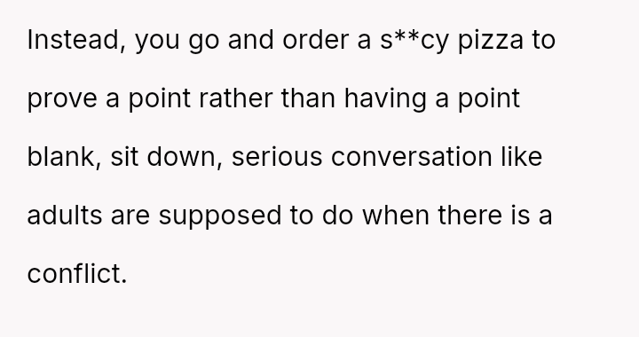 Does the wife's repeated disregard for the husband's explicit requests regarding his food const*tute a v***ation of his personal space and needs, or were the husband's final retaliatory actions, such as heavily s**cing his pizza, an inappropriate overreaction that prioritized petty revenge over marital respect?
