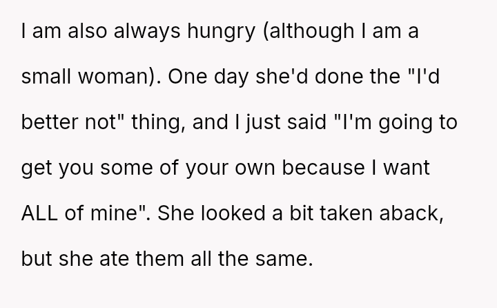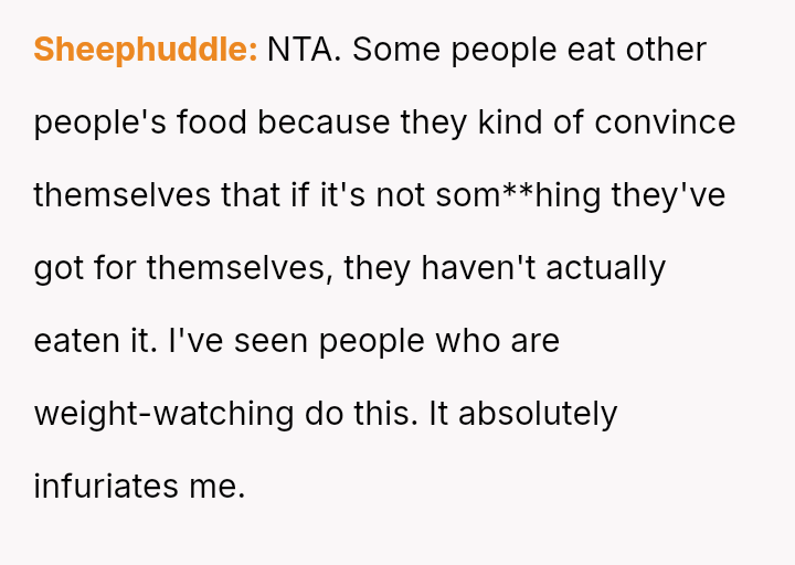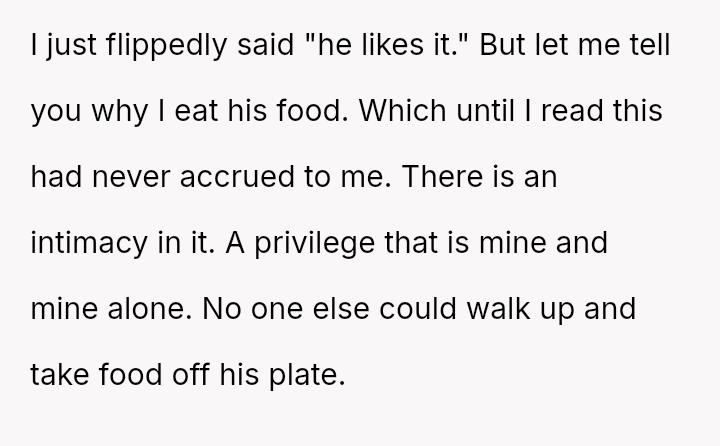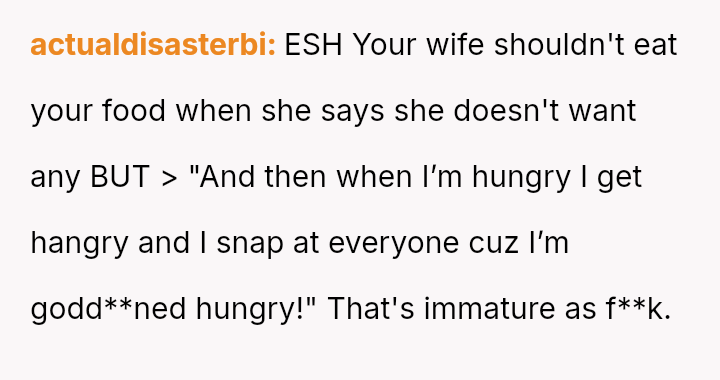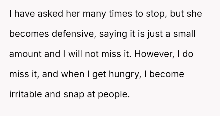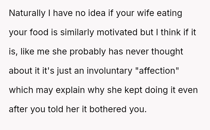 The original poster is deeply frustrated because his wife repeatedly takes portions of his food, which directly impacts his well-being due to his high caloric needs and tendency to become irritable when hungry.