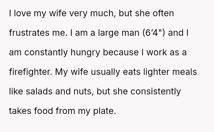 He loves his wife fiercely, but the constant battle over food chips away at his patience. As a towering firefighter with an insatiable hunger, every bite is sacred fuel, yet she casually takes from his plate, dismissing his frustration as petty.