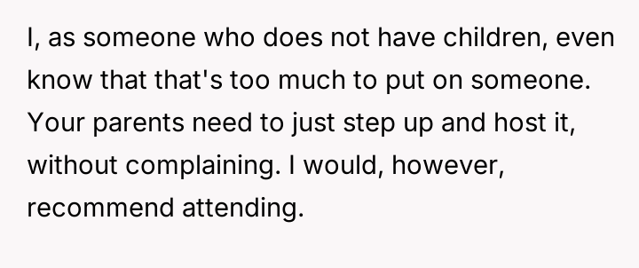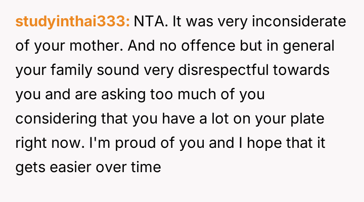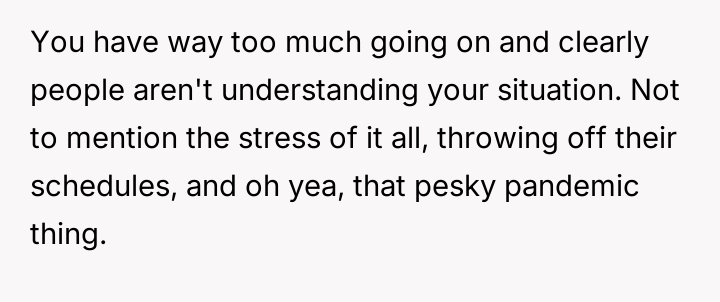 Her family is now pressuring her to reverse her decision, accusing her of being unreasonable for prioritizing her immediate, delicate household needs over their previously made arrangements.