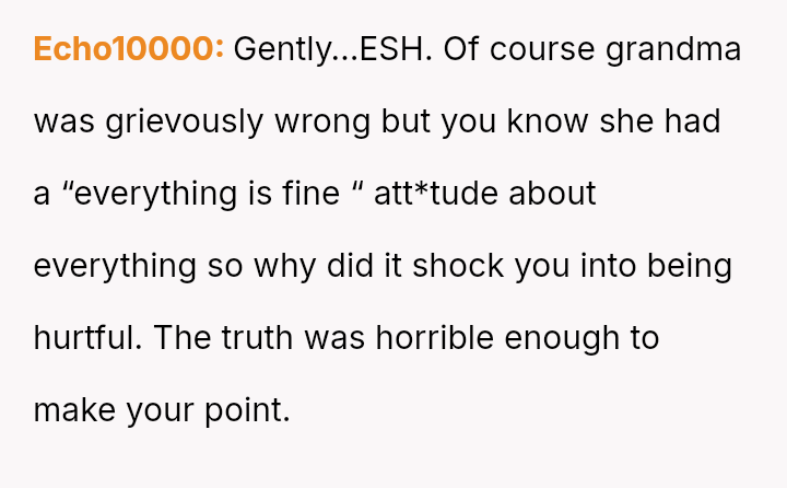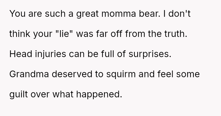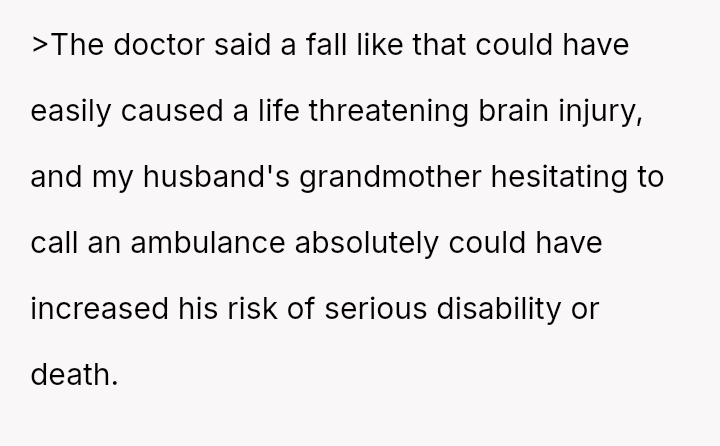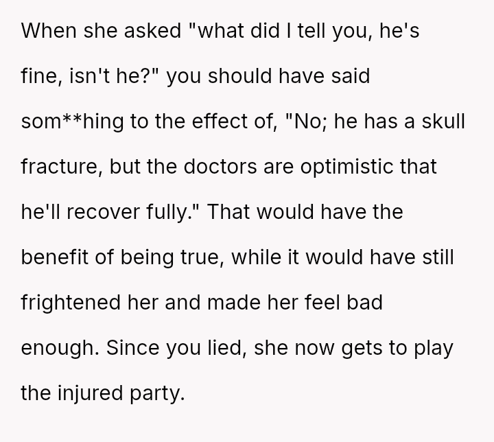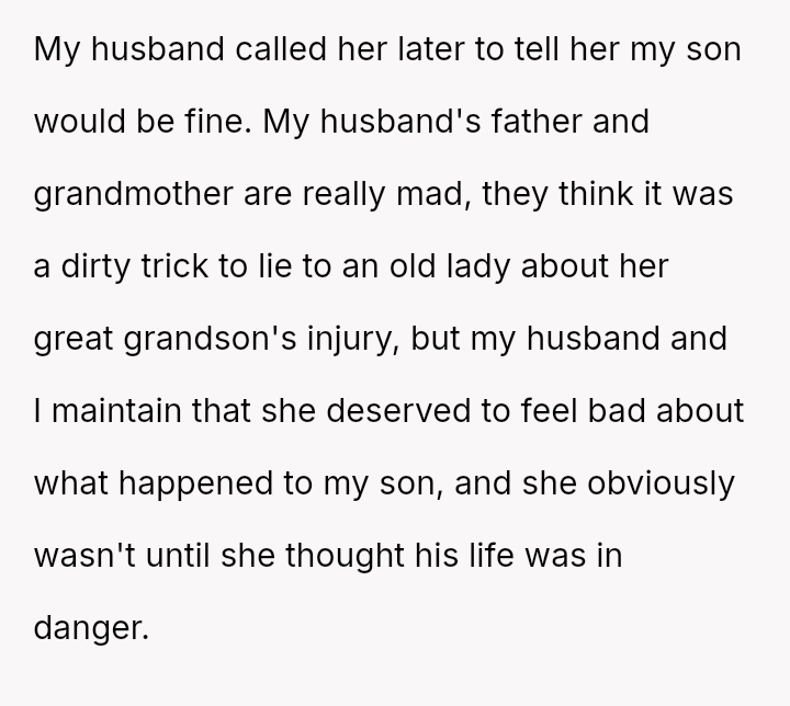 Given the life-threatening nature of the incident and the grandmother's initial failure to seek appropriate medical help, was the OP justified in lying about the severity of the injury to ensure the grandmother understood the gravity of her actions, or did this action cross an ethical line in family relations?