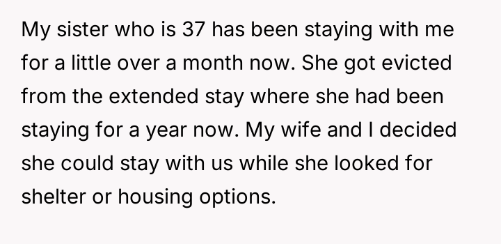 This event triggered an intense emotional reaction, leading the OP to immediately terminate the arrangement and ask his sister to leave, despite feeling guilty about her subsequent homelessness.