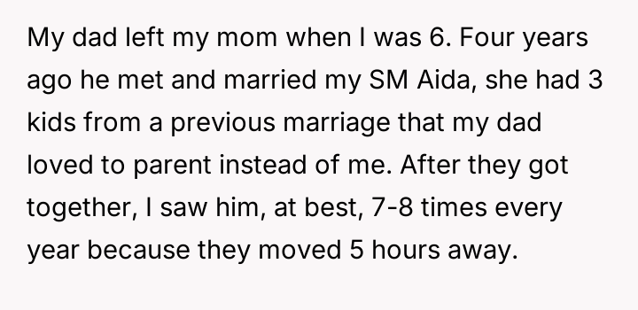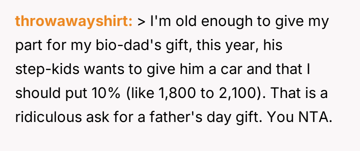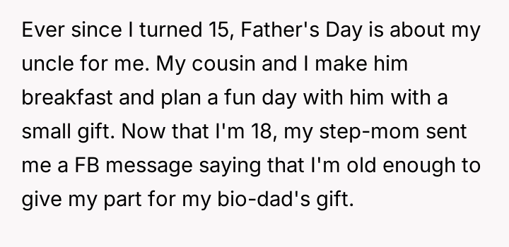 The central conflict arises from the biological father's sudden demand for 50/50 custody years later, followed by the step-mother attempting to enforce financial contribution toward a large gift for the biological father, which directly contradicts the OP's experience of neglect and lack of child support.