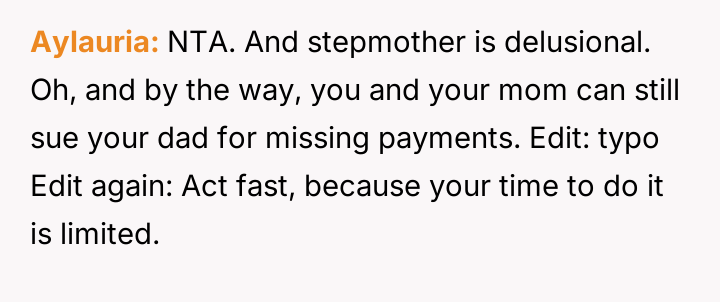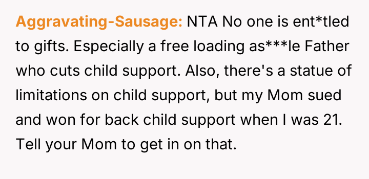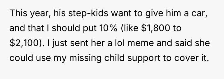 AITA for telling my step-mom that she can use the missing child-support payments to fund my part of my dad's gift?