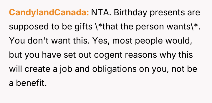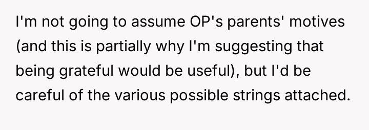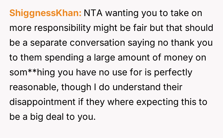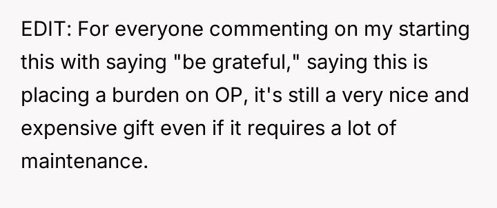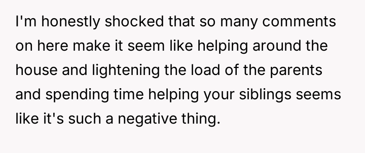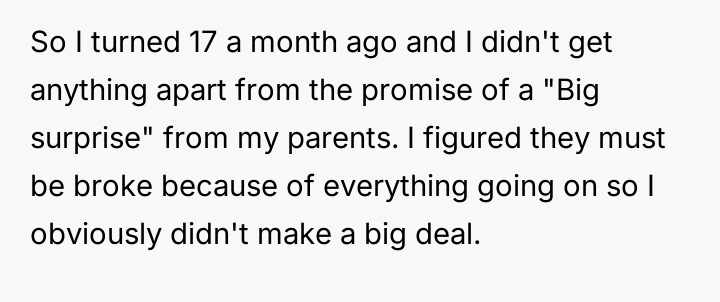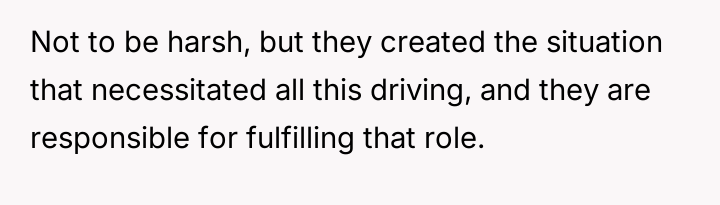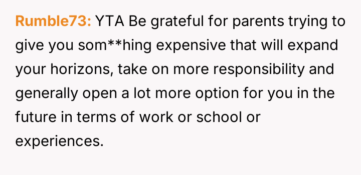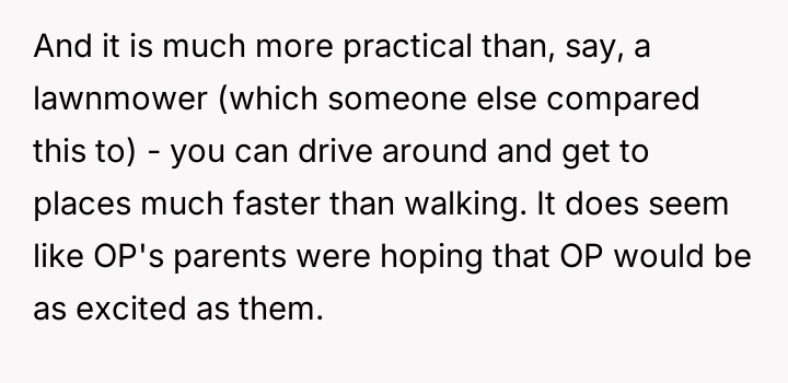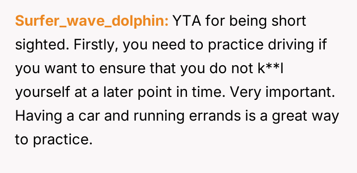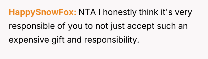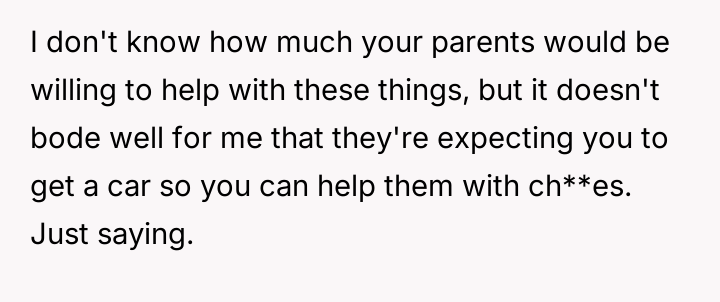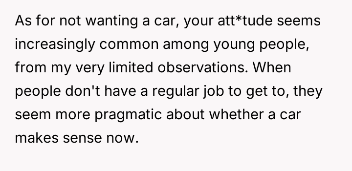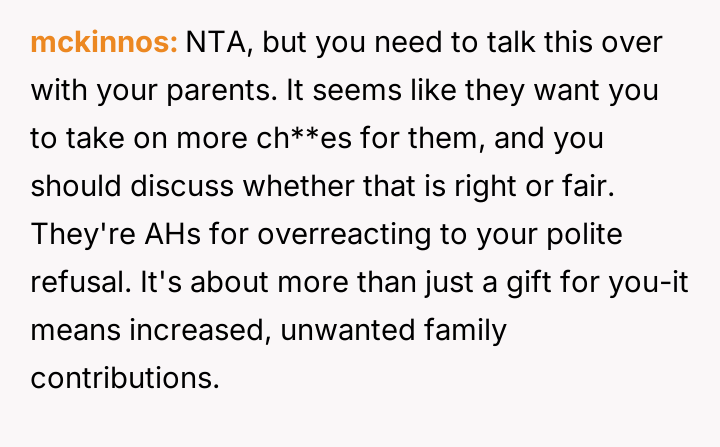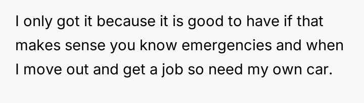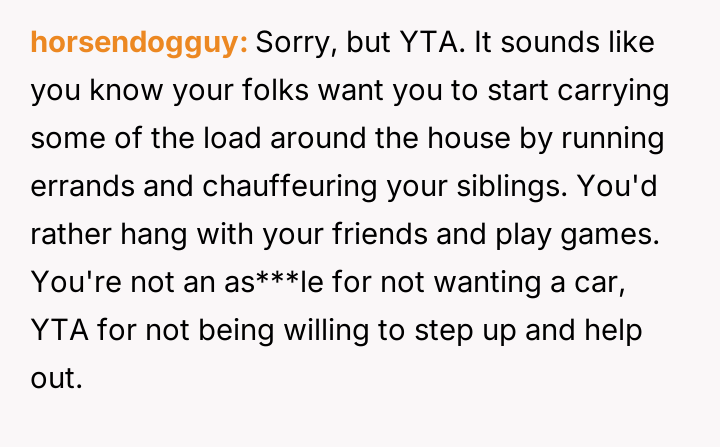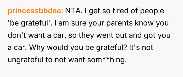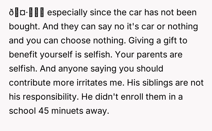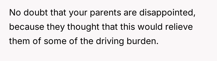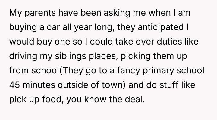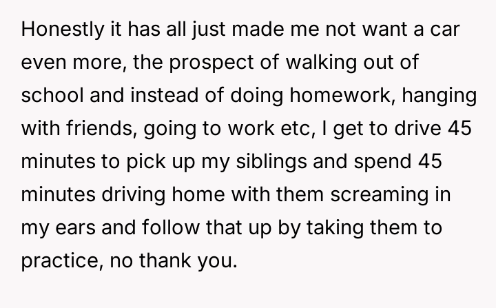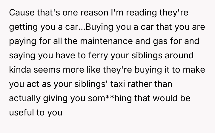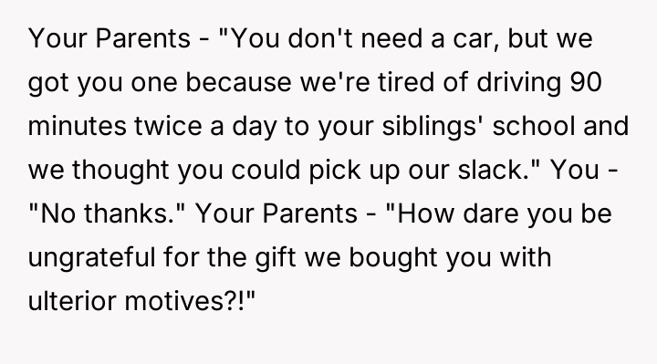 While the parents invested considerable effort and resources into providing a major gift, the OP views the car as a burden that would eliminate their free time by adding substantial chauffeur duties for their younger siblings.