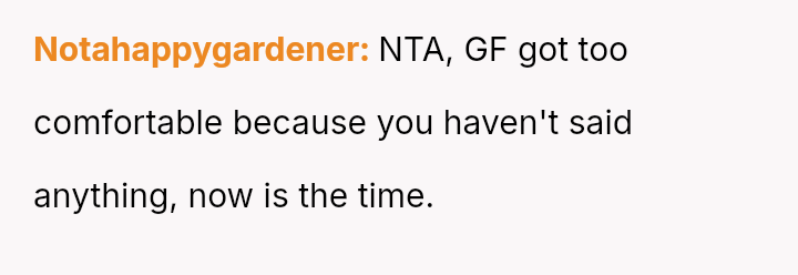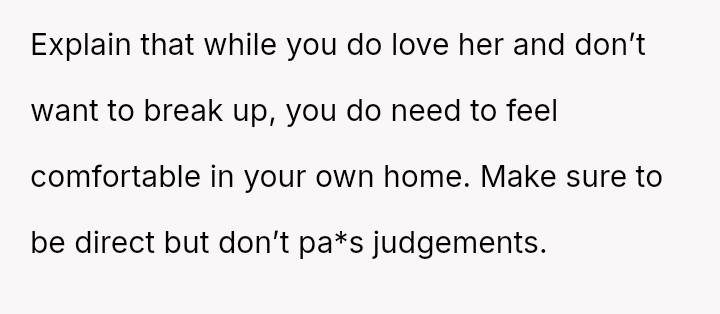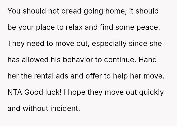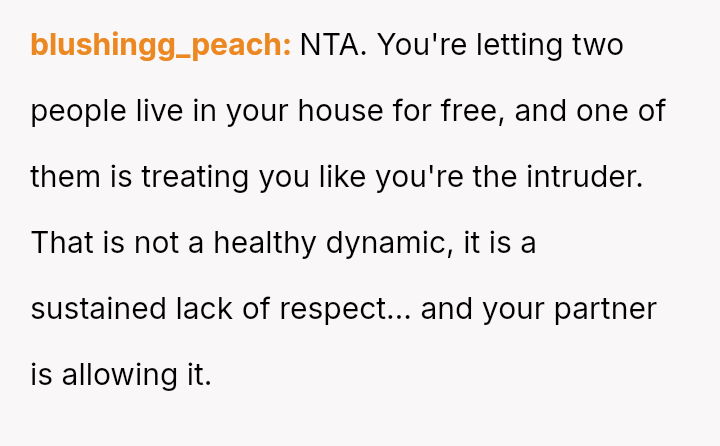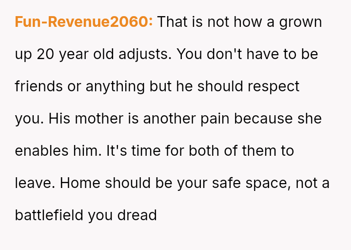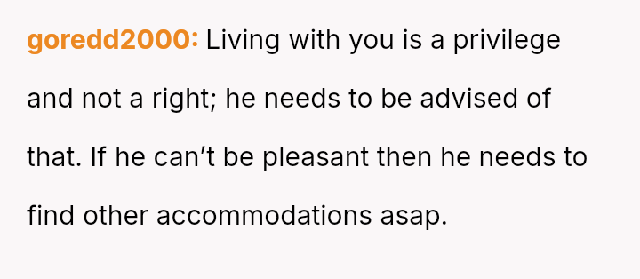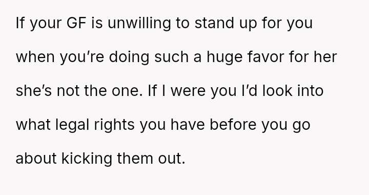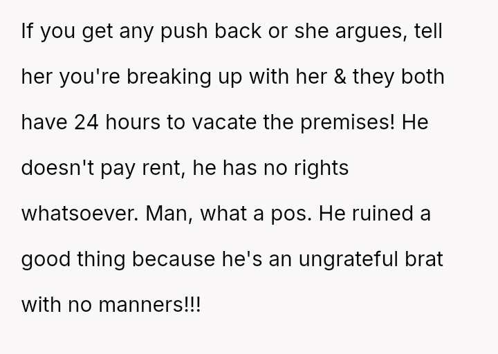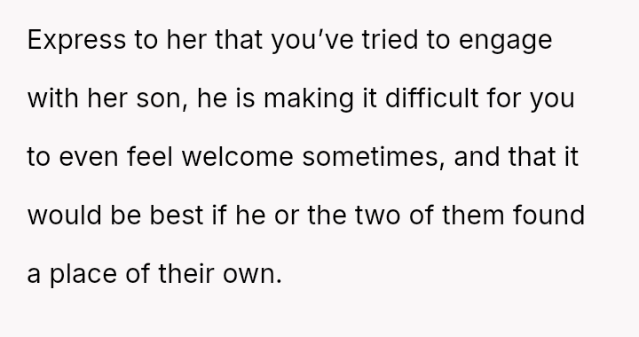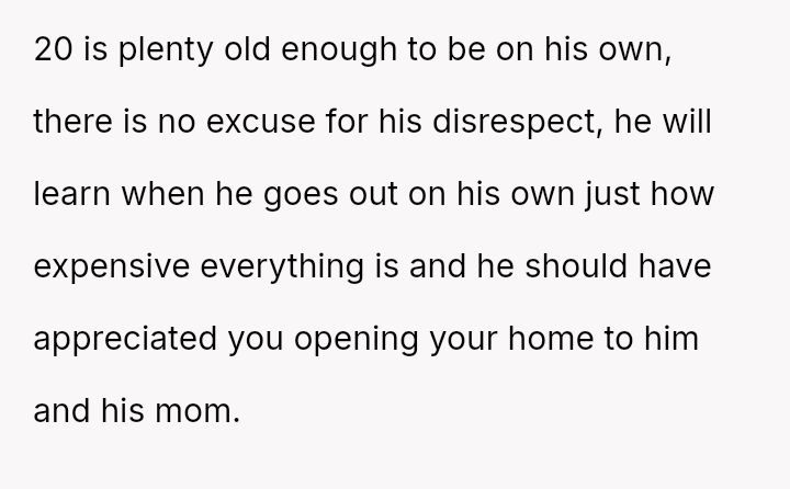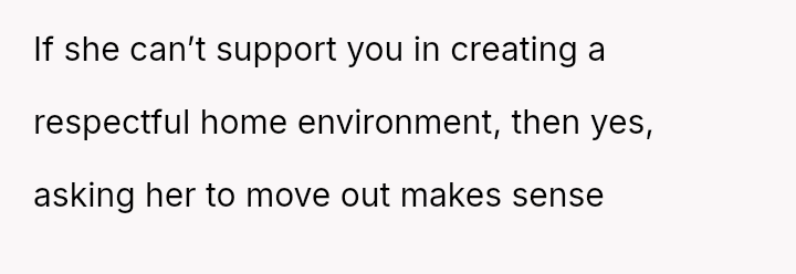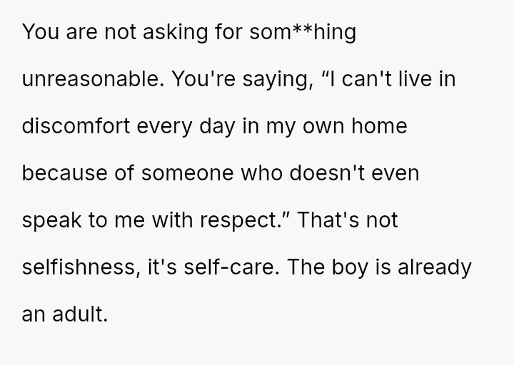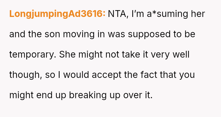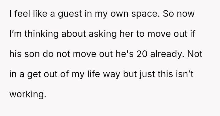 Is the OP justified in prioritizing his need for a respectful living environment by asking the adult son to leave, even if it means creating immediate ins**bility for his girlfriend, or would this action be an unfair ultimatum that compromises the relationship built on his initial goodwill?