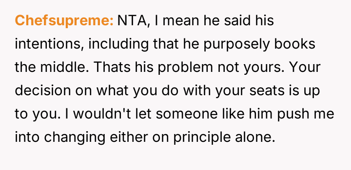 The original poster (OP) prioritized personal preference for specific seats (window and aisle) over accommodating a request, which stemmed from another passenger's deliberate strategy to secure privacy.