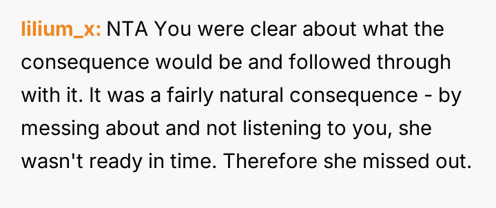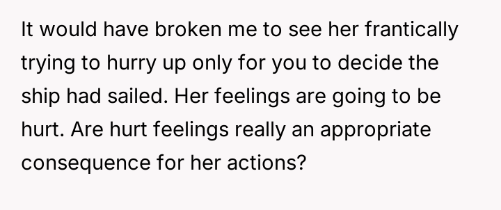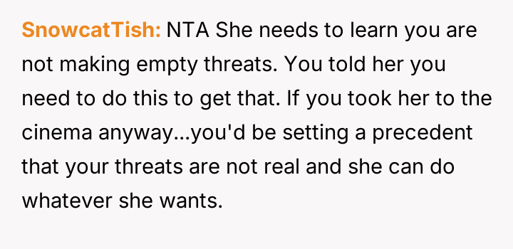 The parent felt the need to enforce a firm consequence for their daughter's persistent difficult behavior by following through on the threat to leave her behind when going to the cinema.